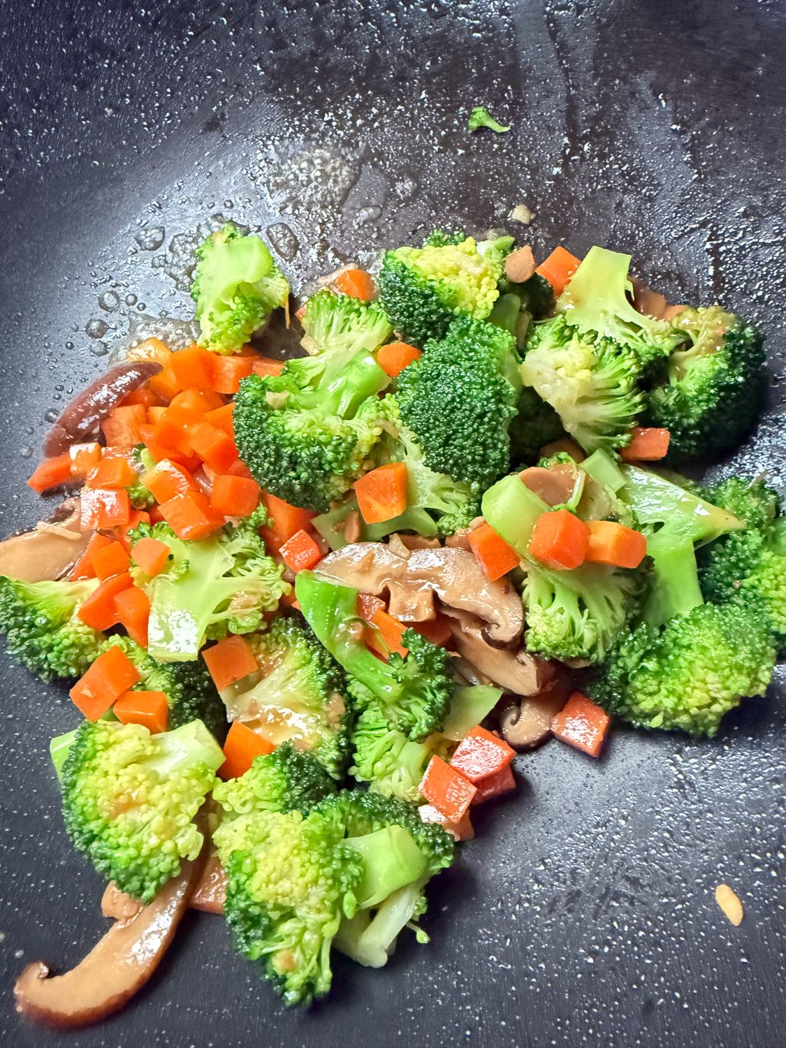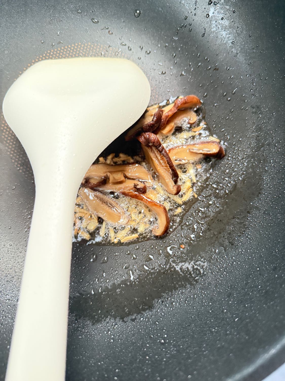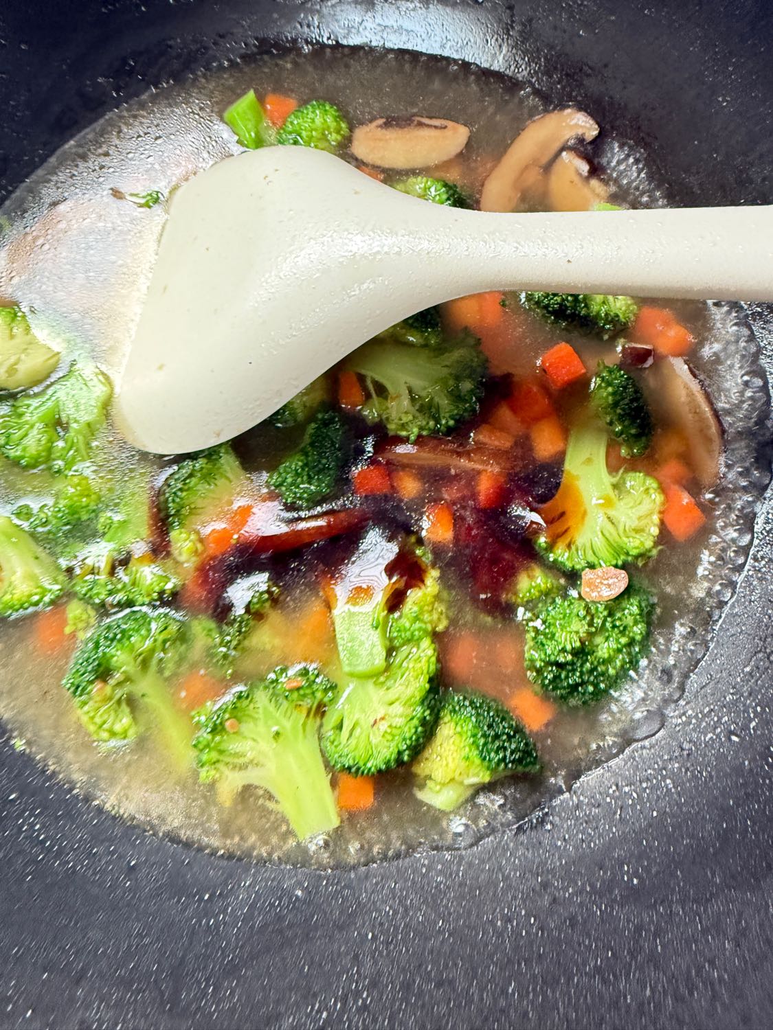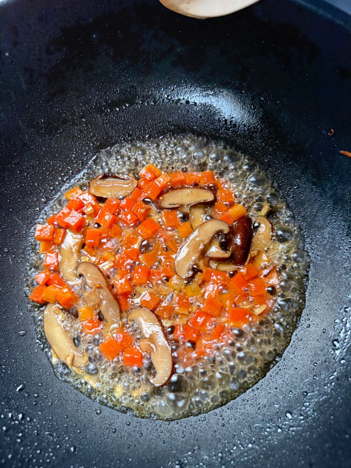 ตามด้วยแครอทผัดพอสุกแล้วเทน้ำแช่เห็ดหอมลงตามไป