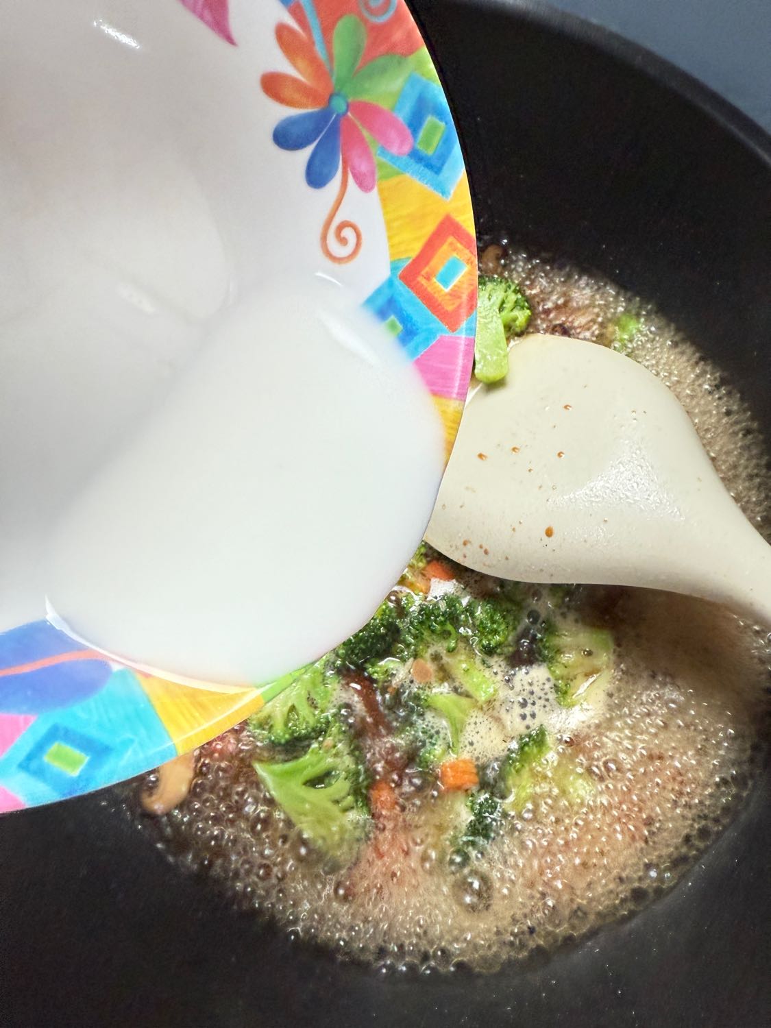 น้ำเดือดดีแล้วเทแป้งข้าวโพดที่ละลายน้ำไว้แล้วลงไป ดูให้น้ำราดหน้าของเราเหนียวจนพอใจ