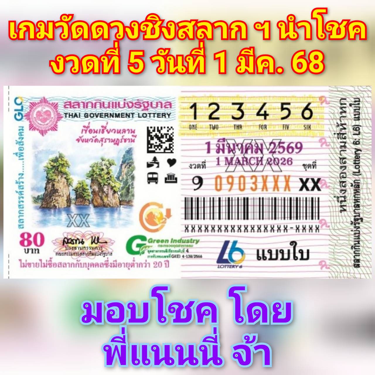 รางวัล :- สลาก ฯ นำโชค งวดที่ 5 วันที่ 1 มีนาคม 2569 จำนวน 3 รางวัล ๆ ละ 3 ใบ และ กิตติมศักดิ์ 1 รางวัล คือ น้องกฤษ จ้า