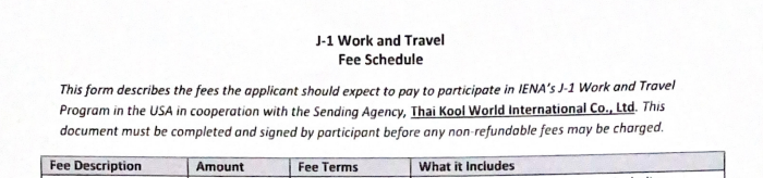 หลังจากทักสอบถาม พูดคุย ทางพี่ๆ ทีมงานจะมีรายการค่าใช้จ่ายในการสมัครจำแนกมาให้เลยอย่างชัดเจนค่ะ ไม่ว่าจะเป็นค่าสมัครโปรแกรม WAT (ในส่วนนี้จะรวมๆ ในเรื่องการช่วยจัดหางานที่นู้น / แบบฟอร์มในการสมัคร J-1 / ประกันสุขภาพ / ทีมงานที่สนับสนุนในสหรัฐตลอด 24 ชั่วโมง และการบริการด้านเอกสาร ที่ทางทีมงานจะช่วยเช็กความเรียบร้อย ความพร้อมของเอกสารต่างๆ) , ค่าวีซ่า และอื่นๆ จำได้ว่ารวมทั้งหมดแบบพร้อมบิน + เงินที่เตรียมไป ทั้งหมดรวมแสนกว่าๆ **ราคานี้ตามงบของแต่ละคนอาจจะไม่เท่ากันนะคะ อยู่ที่ราคาตั๋วเครื่องบิน ณ ตอนนั้น และเงินที่พกติดตัวไปใช้ก่อนวันเริ่มทำงาน
