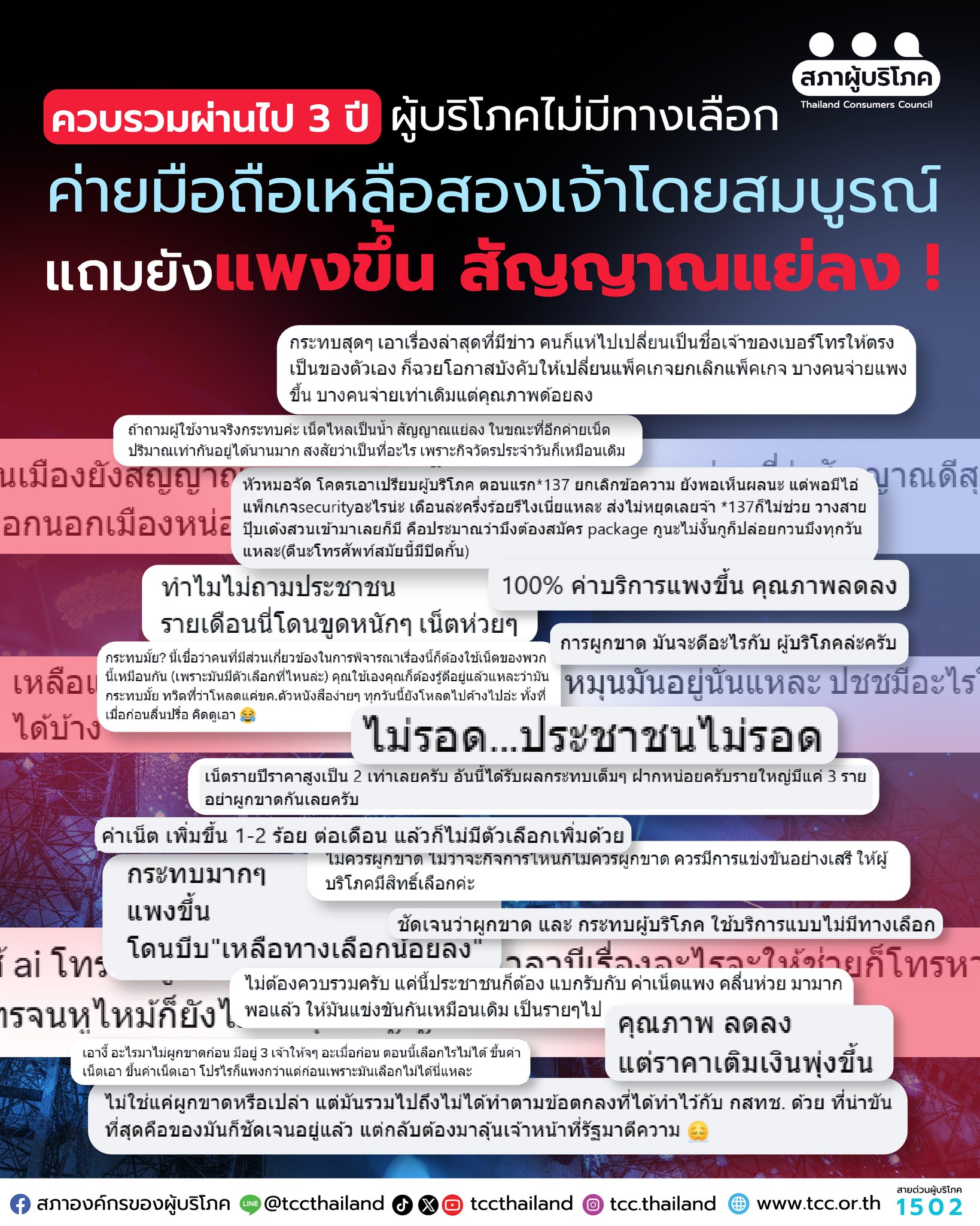 เหรียญมี 2 ด้านฉันใด มีคนยิ้มก็มีคนหน้าบึ้ง มีคนได้ก็มีคนเสีย ดูเหมือนว่าแม้ในปัจจุบันก็มีเสียงร้องเรียนจากผู้ใช้งานจำนวนมาก โดยสภาองค์กรผู้บริโภคระบุ “แพงขึ้นและไม่ได้ดีขึ้น” คือประโยคสั้น ๆ ที่อธิบายชีวิตผู้บริโภคหลังการควบรวมกิจการโทรคมนาคมได้ชัดที่สุด ทั้งเน็ตบ้านและมือถือ ค่าโทร ค่าเน็ตขยับสูงขึ้น แต่คุณภาพบริการกลับถดถอย แพ็กเกจที่เคยมีหายไป อินเทอร์เน็ตช้าลง สัญญาณไม่เสถียร และไม่สามารถย้ายไปหาทางเลือกอื่นได้จริง ที่น่ากังวลที่สุดคือ ผู้บริโภคแทบไม่มีทางเลือก มีการร้องเรียนมากมายผ่านช่องทางต่างๆของรัฐและองค์กรคุ้มครองผู้บริโภคที่เกี่ยวข้องต่างๆ
