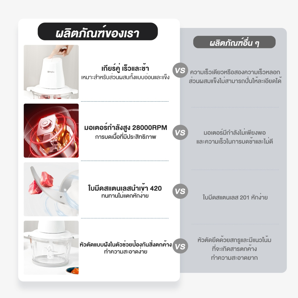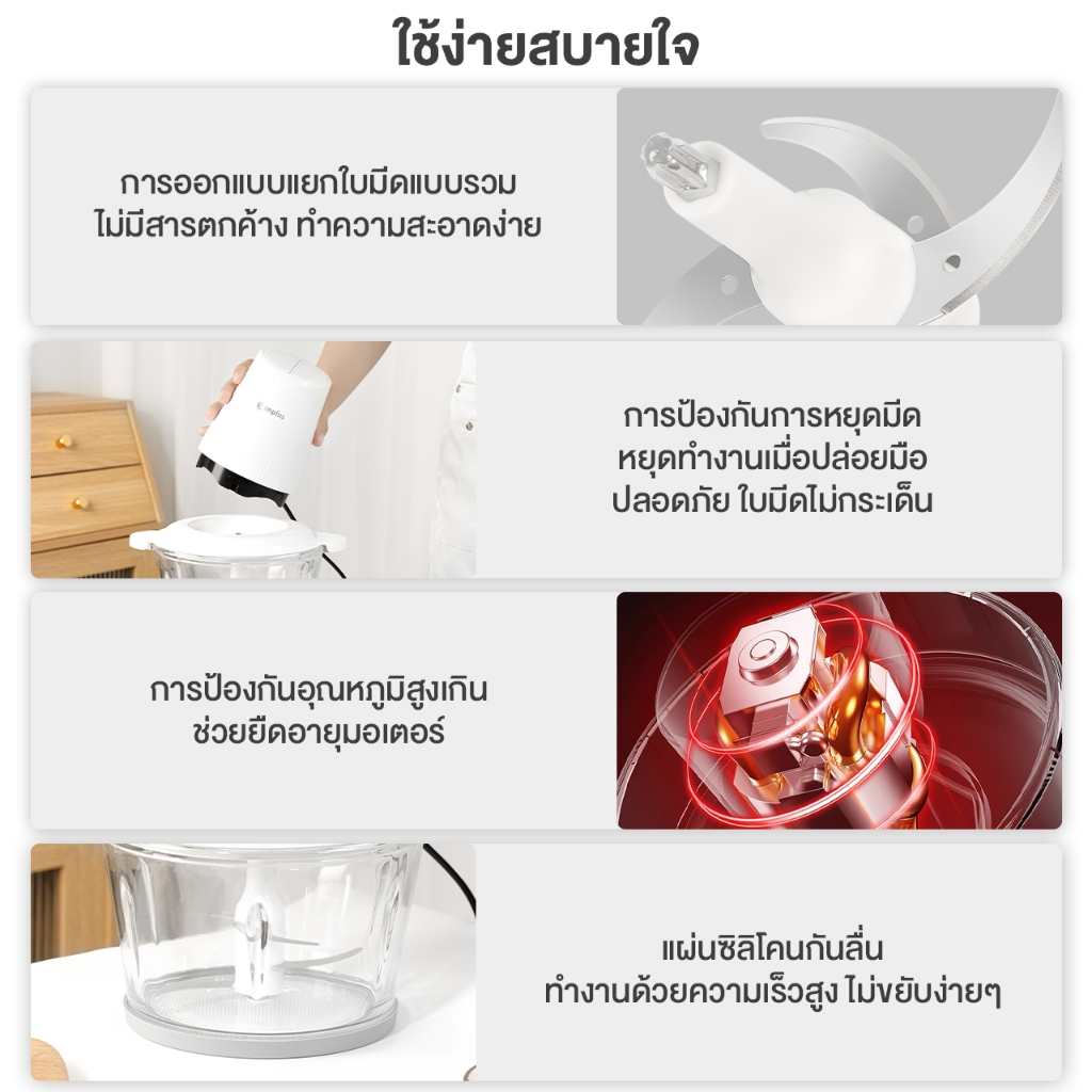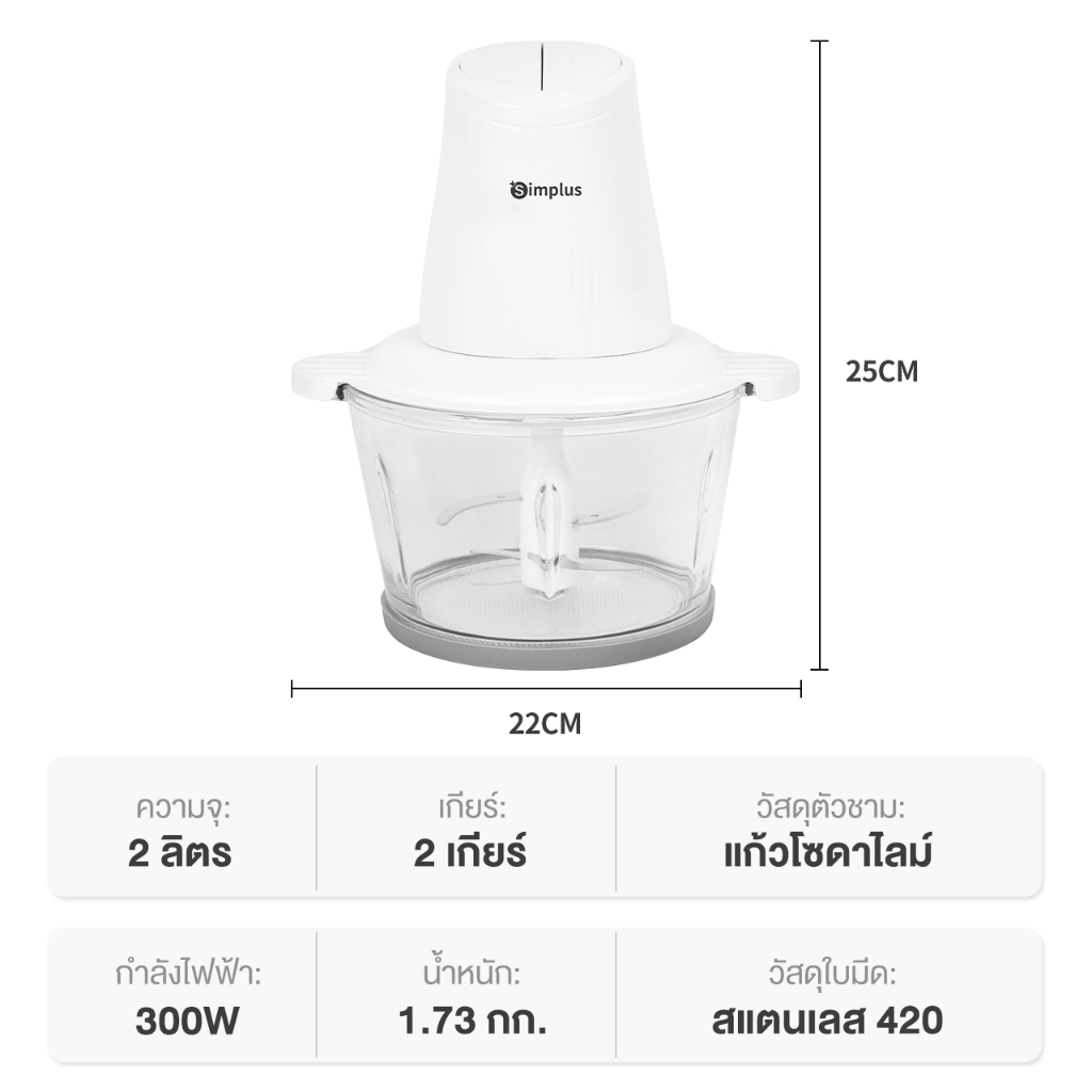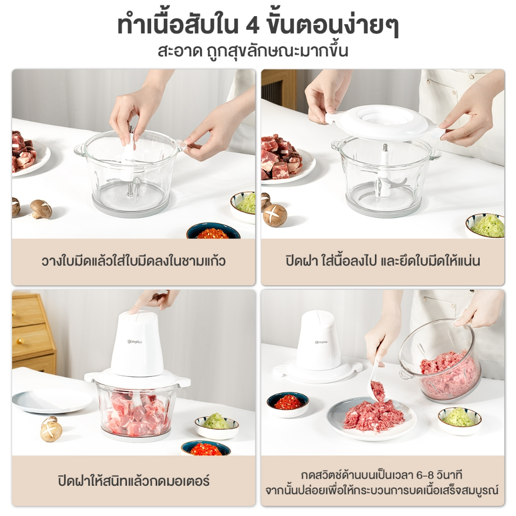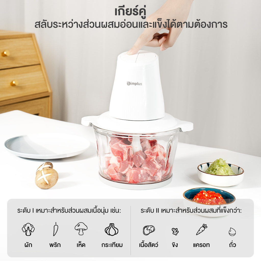 ถ้ากำลังมองหา เครื่องปั่นมือถือ Simplus 4in1 ไว้ช่วยเตรียมวัตถุดิบในครัวแบบไม่เสียเวลา รุ่นนี้ทำงานเร็ว บดเนื้อ/ผักได้ใน 6 วินาที ใช้มอเตอร์ 300W ความเร็ว 28000RPM และโถแก้วโซดาไลม์ความจุ 2 ลิตร บดได้ครั้งละราว 800 กรัม เหมาะทำหมูสับ น้ำพริก หรือไส้เกี๊ยวให้เนื้อเนียนสม่ำเสมอ 🥩