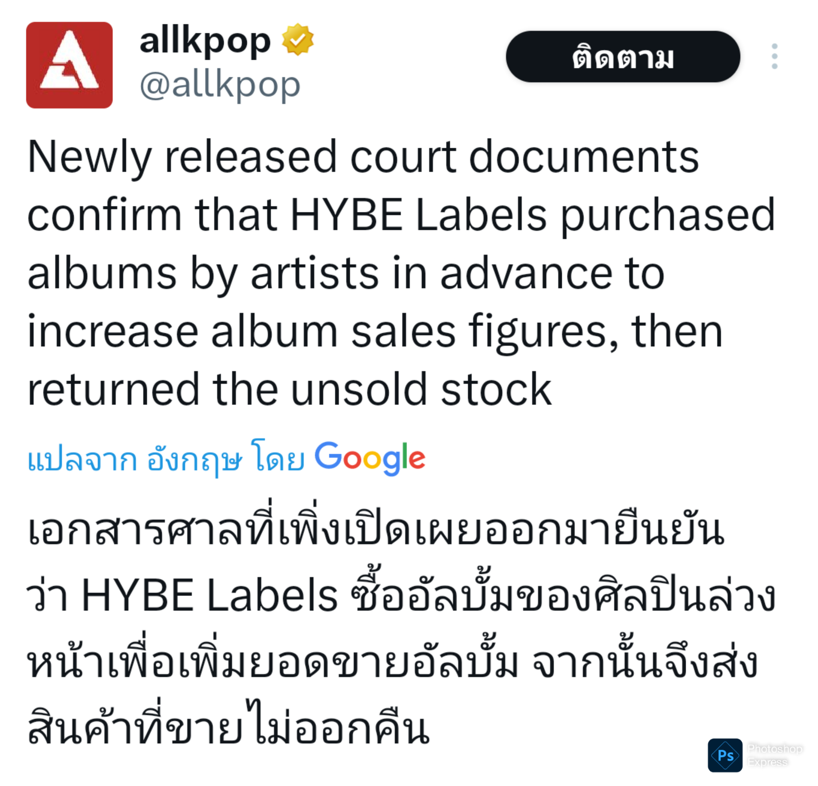 สื่ออย่าง allkpop รายงานว่าล่าสุดเอกสารศาลเผยว่า HYBE ซื้ออัลบั้มศิลปินตัวเองล่วงหน้าเพื่อเพิ่มยอดขายพอขายไม่ออกก็ส่งคืน
