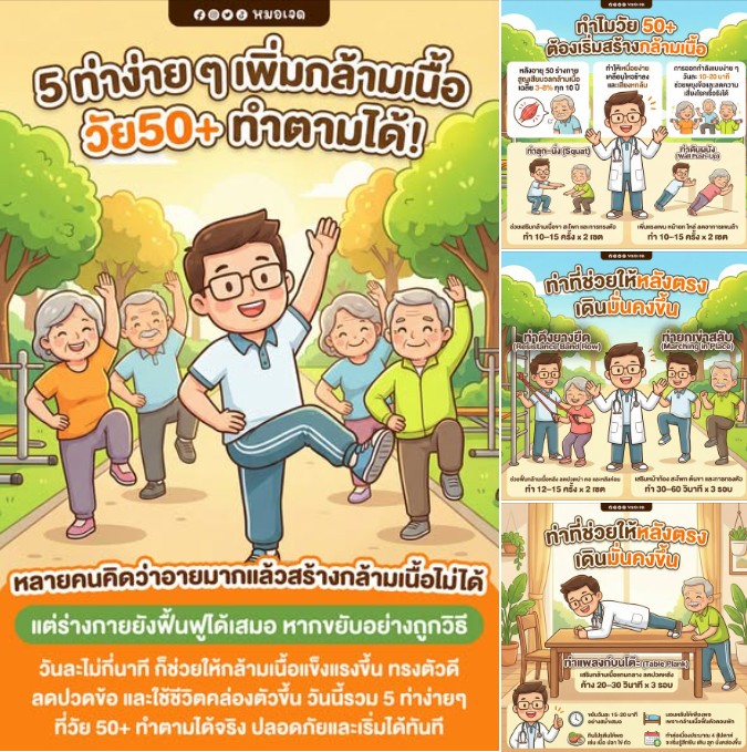วัย 50+ ไม่จำเป็นต้องกลัวว่า “กล้ามเนื้อจะหายไป” ถ้าเริ่มขยับสม่ำเสมอด้วยท่าพื้นฐานแบบนี้ วันละ 15–20 นาที ก็พอแล้ว อย่าลืมกินโปรตีนให้พอ พวกเนื้อ ปลา ไข่ ถั่ว และพักผ่อนให้เพียงพอ เพราะกล้ามเนื้อไม่ได้โตตอนออกกำลังเท่านั้นนะครับ แต่โตตอนพักด้วย แค่เริ่มวันนี้อีก 4 สัปดาห์ แล้วร่างกายเราจะเบาขึ้น ยืน เดิน ลุก นั่งได้คล่องกว่าเดิมแน่นอนครับ
