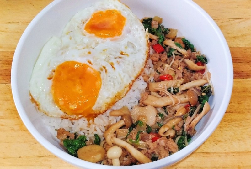 ข้าวกะเพราเห็ดสามอย่างหมูสับ ค่ะ