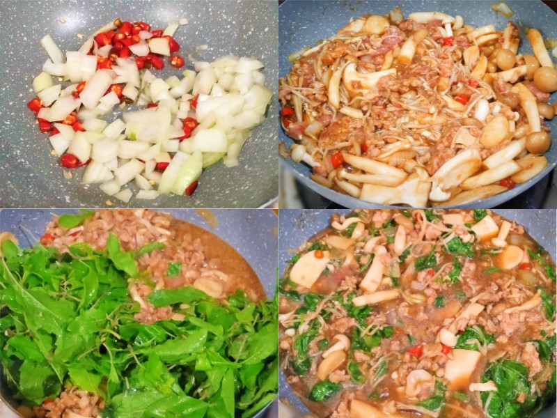 ผัดพริกกับหัวหอมใหญ่จนใส แล้วใส่หมูสับกับเห็ด