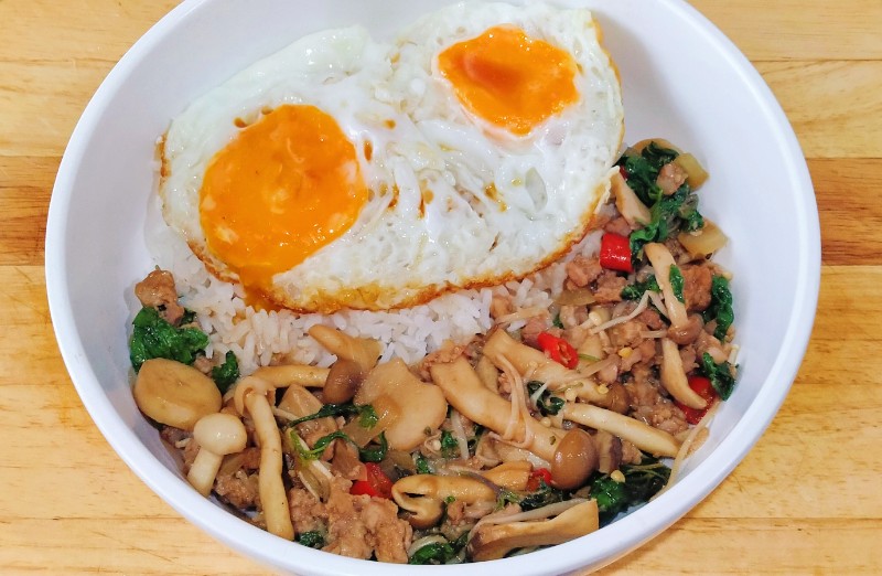 ข้าวกะเพราเห็ดสามอย่างหมูสับ 🍛🍄🌿