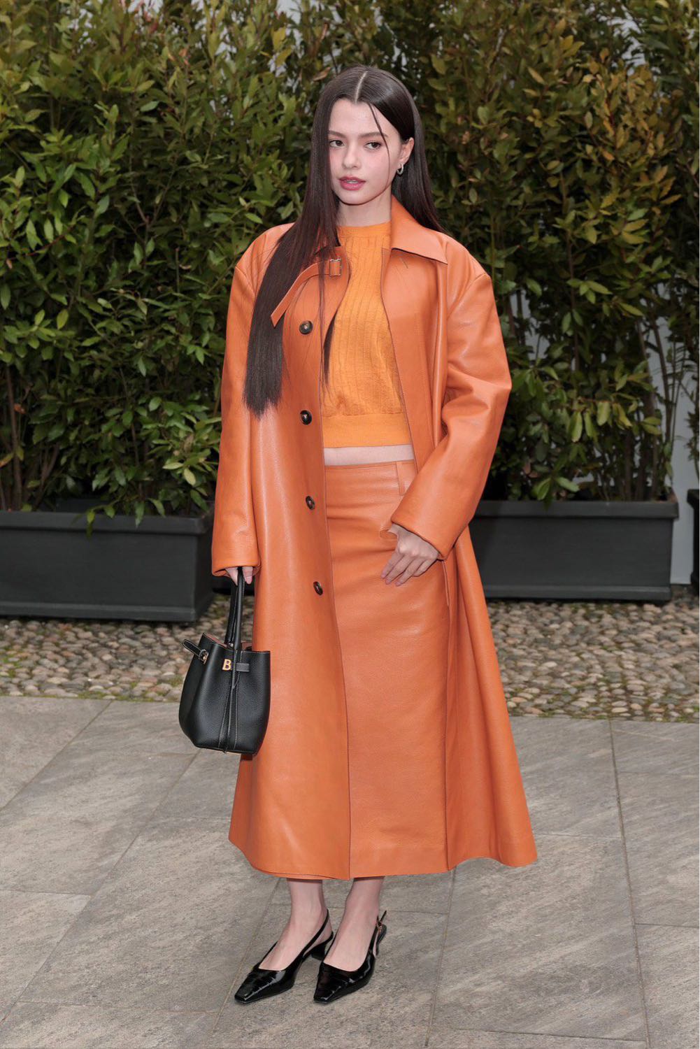 ภายใต้เลเยอร์คือครอปไหมพรมถักลายริบในเฉดสีใกล้เคียงกัน เทคนิค tonal dressing ทำให้ลุคทั้งชุดดูกลมกลืน ขณะเดียวกันก็เปิดพื้นที่ให้ผิวหนังบริเวณเอวเล็กน้อย เพิ่มมิติของลุคโดยรวม แมตซ์เข้ากับกระโปรงหนังยาวทรงเอเอวสูงทำหน้าที่บาลานซ์สัดส่วนที่มั่นคง ไม่หวือหวา แต่เปี่ยมด้วยพลัง