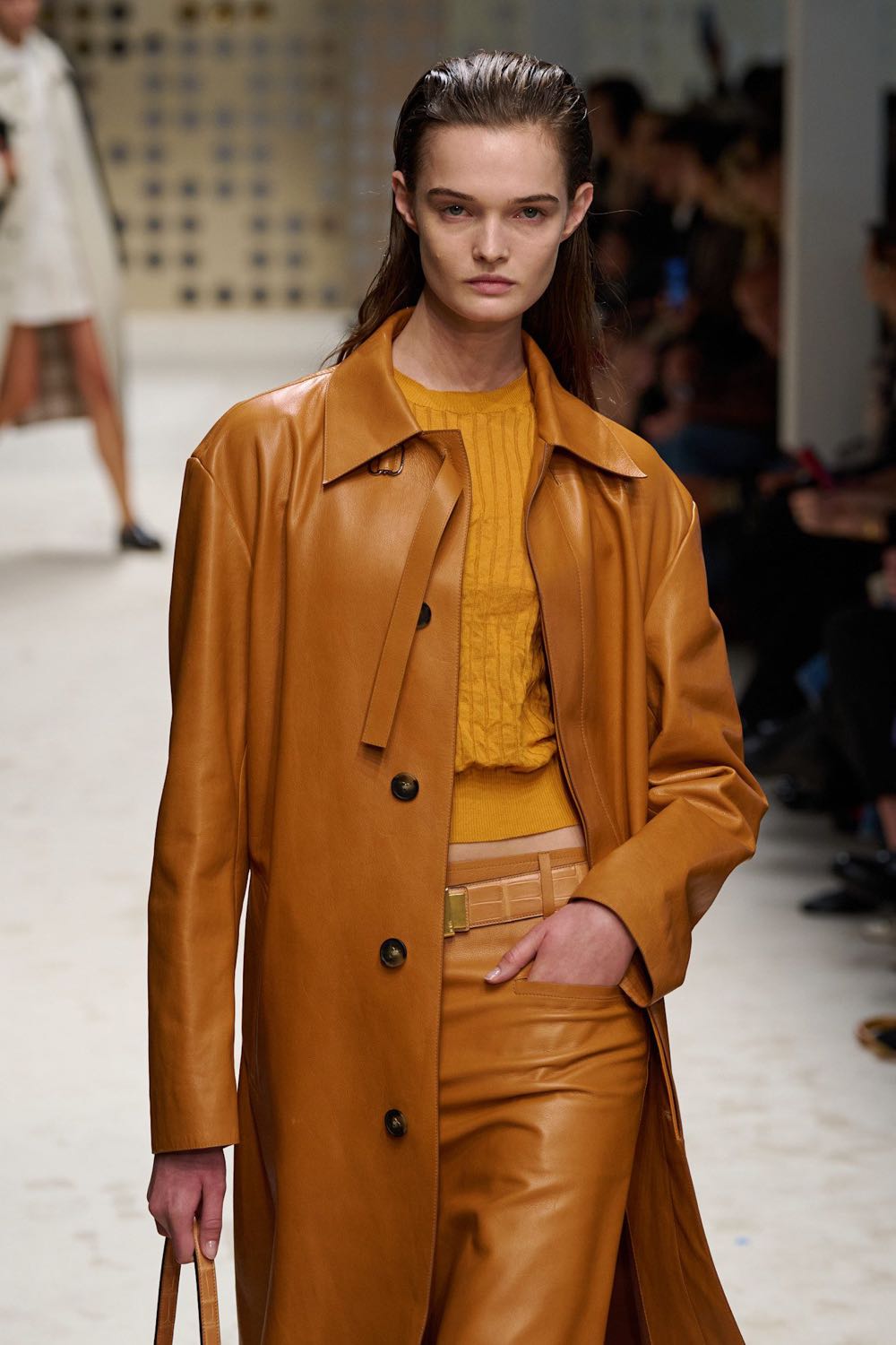ซิลูเอตหลักถูกกำหนดด้วยโค้ตหนังยาวทรงตรงในโทน Burnt Orange ที่ให้สัมผัสอบอุ่นแต่เฉียบคม งานหนังเรียบเนียนและเส้นตัดที่คมชัดตอกย้ำความเชี่ยวชาญซึ่งเป็นรากฐานของแบรนด์ การเลือกกระดุมหน้าแบบมินิมอลและโครงสร้างไหล่ที่พอดีตัว ช่วยสร้างภาพลักษณ์ของ “modern authority” ที่ดูไม่แข็งจนเกินไป