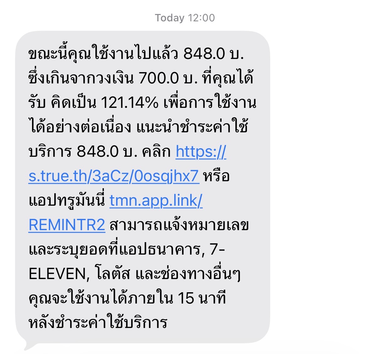 แพ็ค 399 ค่ะ มีวงเงิน 600 แต่มี SMS มาแจ้งว่าใช้วงเงินไปแล้ว 595 ให้ไปชำระค่าบริการ งงค่ะ ต้องชำระอะไร ยังไม่ถึงรอบบิลเลย ลองไปเช็คในแอปทรูไอเซอร์วิสแล้วก็ไม่มี