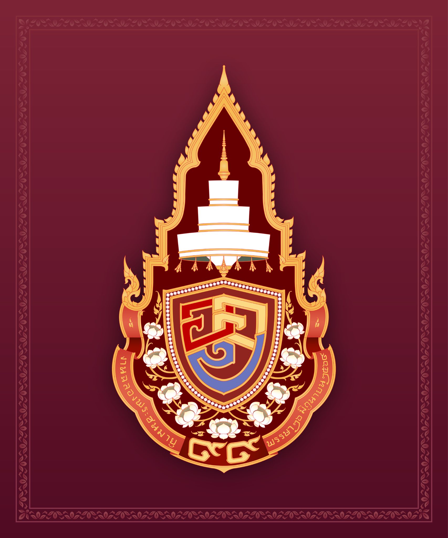 The emblem displays the royal monogram of His Holiness Somdet Phra Ariyavongsagatayana, the Supreme Patriarch of Thailand, gracefully placed beneath a three-tiered white royal umbrella adorned with golden champaka tassels, in accordance with his exalted ecclesiastical rank. Encircling the monogram are 99 radiant gems, symbolizing the resplendent wisdom that His Holiness has cultivated and steadfastly embodied throughout his 99 years.