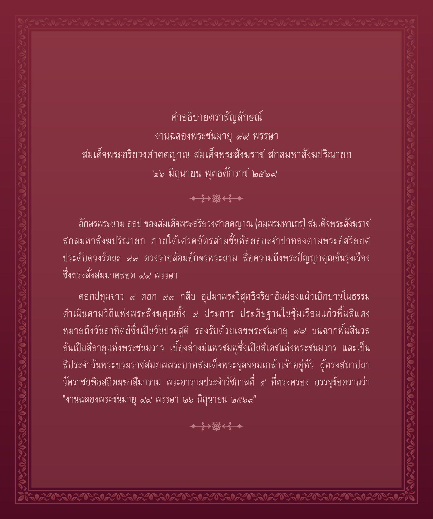 ดอกปทุมขาว ๙ ดอก ๙๙ กลีบ อุปมาพระวิสุทธิจริยาอันผ่องแผ้วเบิกบานในธรรม ดำเนินตามวิถีแห่งพระสังฆคุณทั้ง ๙ ประการ ประดิษฐานในซุ้มเรือนแก้วพื้นสีแดง หมายถึงวันอาทิตย์ซึ่งเป็นวันประสูติ รองรับด้วยเลขพระชนมายุ ๙๙ บนฉากพื้นสีนวลอันเป็นสีอายุแห่งพระชนมวาร เบื้องล่างมีแพรชมพูซึ่งเป็นสีเดชแห่งพระชนมวาร และเป็นสีประจำวันพระบรมราชสมภพพระบาทสมเด็จพระจุลจอมเกล้าเจ้าอยู่หัว ผู้ทรงสถาปนาวัดราชบพิธสถิตมหาสีมาราม พระอารามประจำรัชกาลที่ ๕ ที่ทรงครอง บรรจุข้อความว่า “งานฉลองพระชนมายุ ๙๙ พรรษา ๒๖ มิถุนายน ๒๕๖๙”