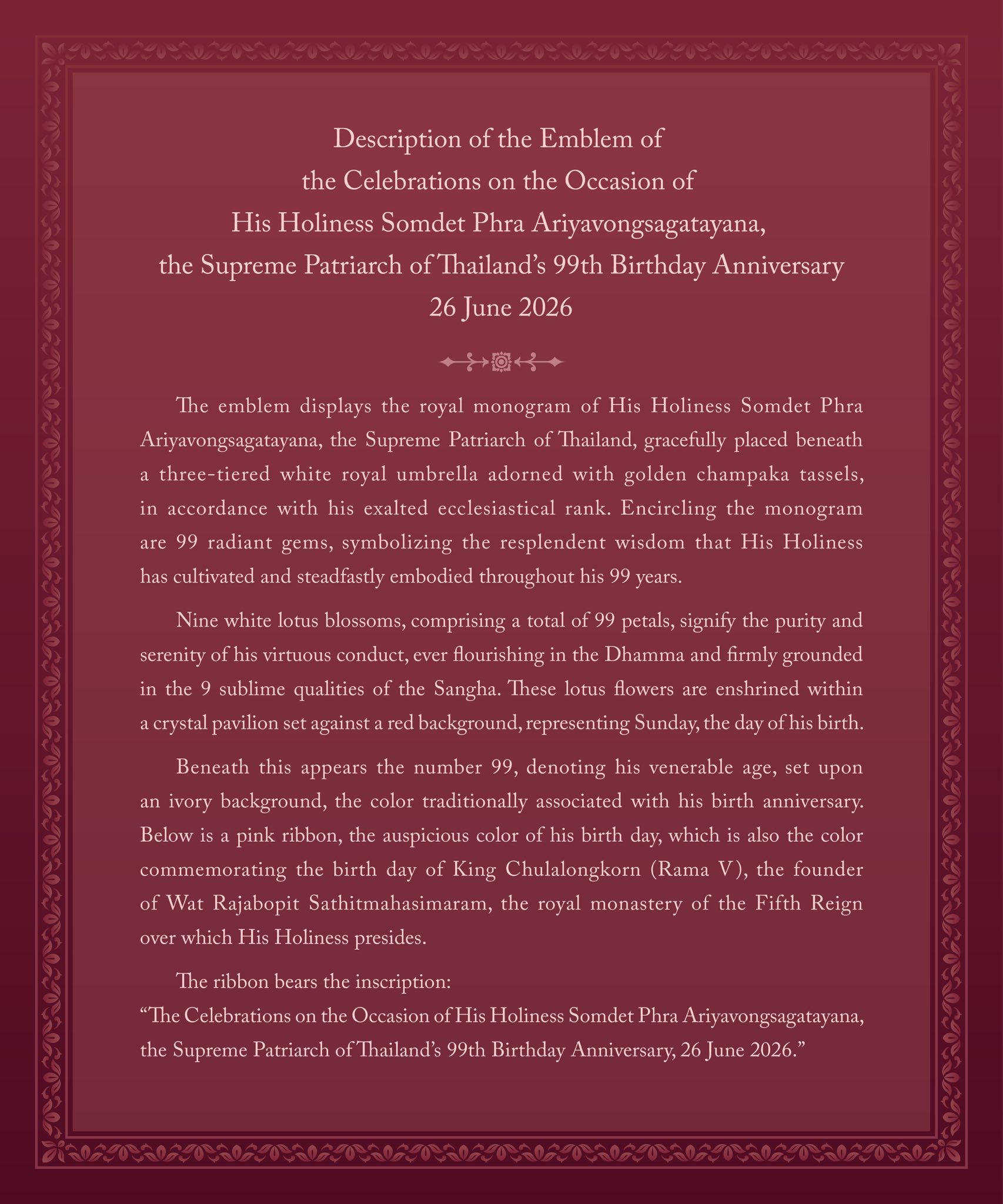 Beneath this appears the number 99, denoting his venerable age, set upon an ivory background, the color traditionally associated with his birth anniversary. Below is a pink ribbon, the auspicious color of his birth day, which is also the color commemorating the birth day of King Chulalongkorn (Rama V), the founder of Wat Rajabopit Sathitmahasimaram, the royal monastery of the Fifth Reign over which His Holiness presides.