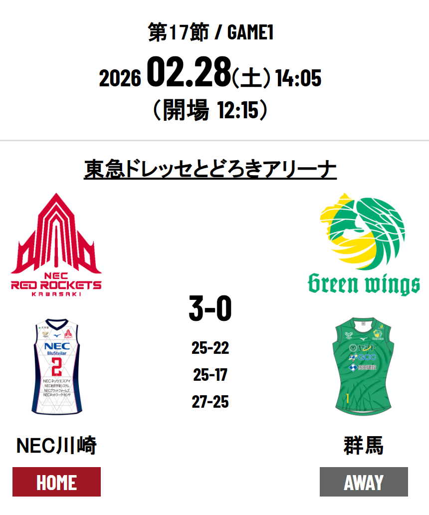 NEC Red Rockets Kawasaki 3 - 0 Gunma Green Wings