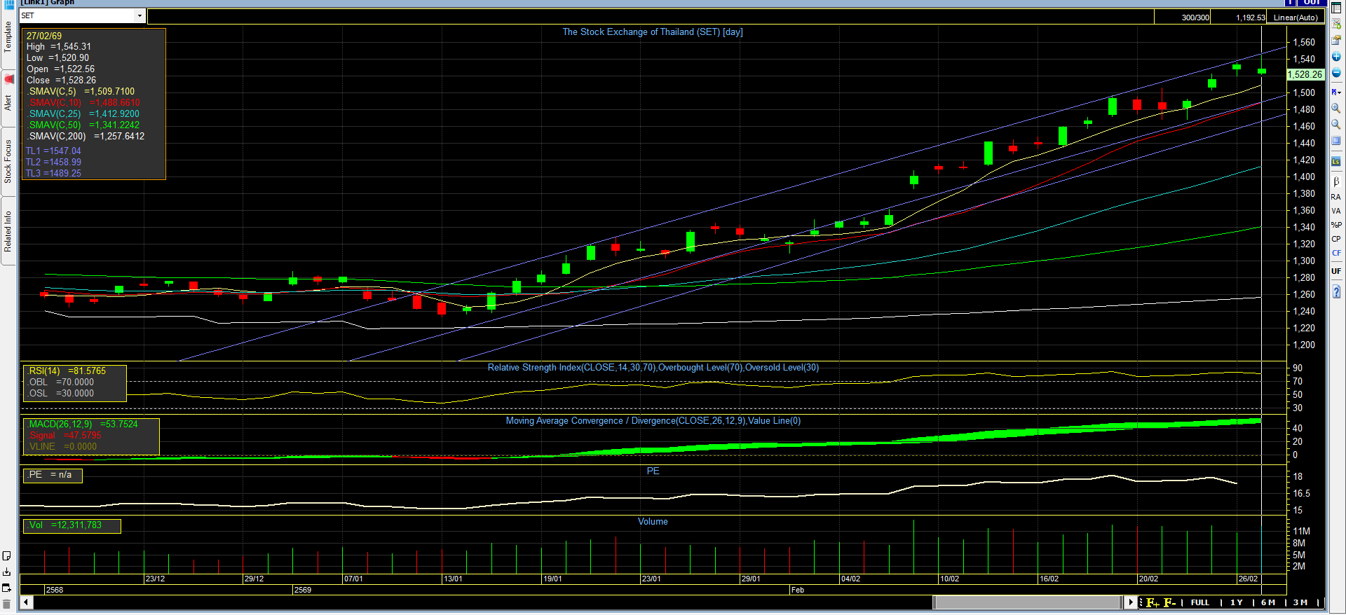 ตลาดหลักทรัพย์ไทย   ยังเคลื่อนตัวอยู่ในเทรนไลน์  มีภาวะซื้อมากเกินไป  แนวโน้มปรับฐาน แนวรับที่ 1510 หรือต่ำกว่าเล็กน้อย  ไม่น่ากังวลอะไร