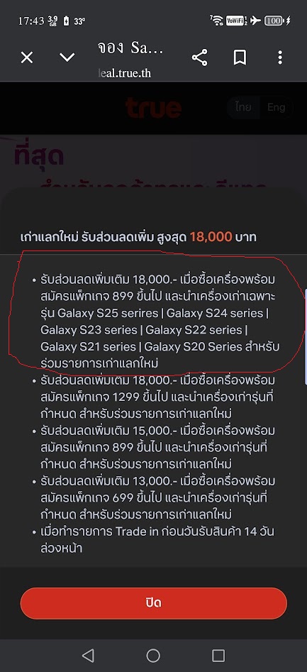 แต่ของทรู ถ้าใช้ โปร 899 บ.อัพ + เครื่องเก่าที่เทรด เป็นรุ่น S-serie S25 S24 S23 S22 S212 S20  จะได้ on top 18,000 ด้วย