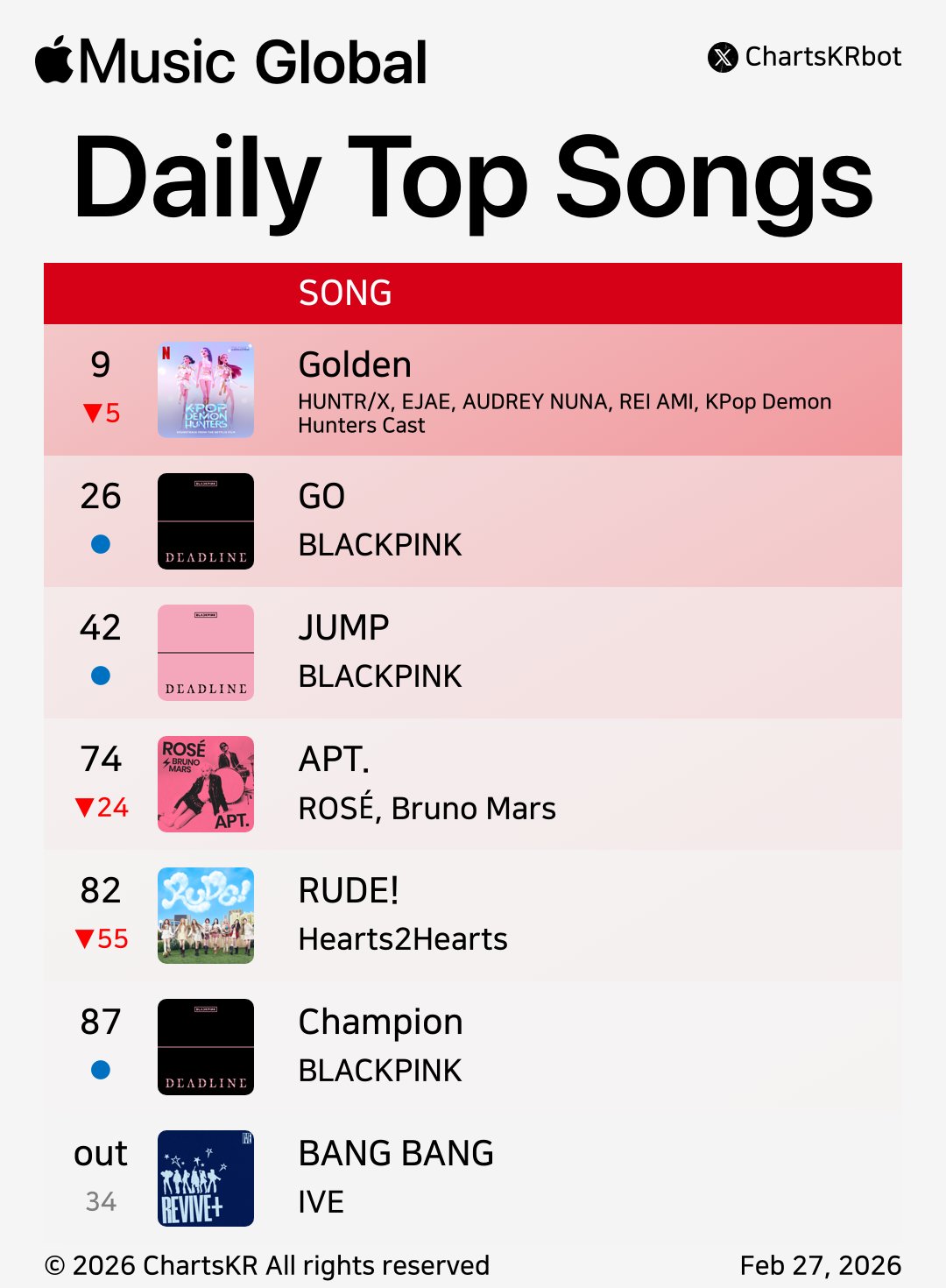 เพลง DRIP ของ BABYMONSTER ยังอยู่บน Global Apple Music Daily Chart โดยอยู่อันดับ 67 เป็นเพียง 1 ใน 4 เพลงเคป๊อปเท่านั้น