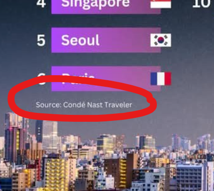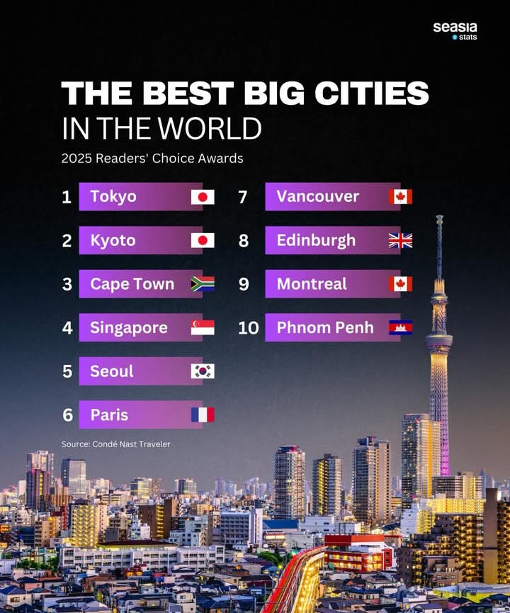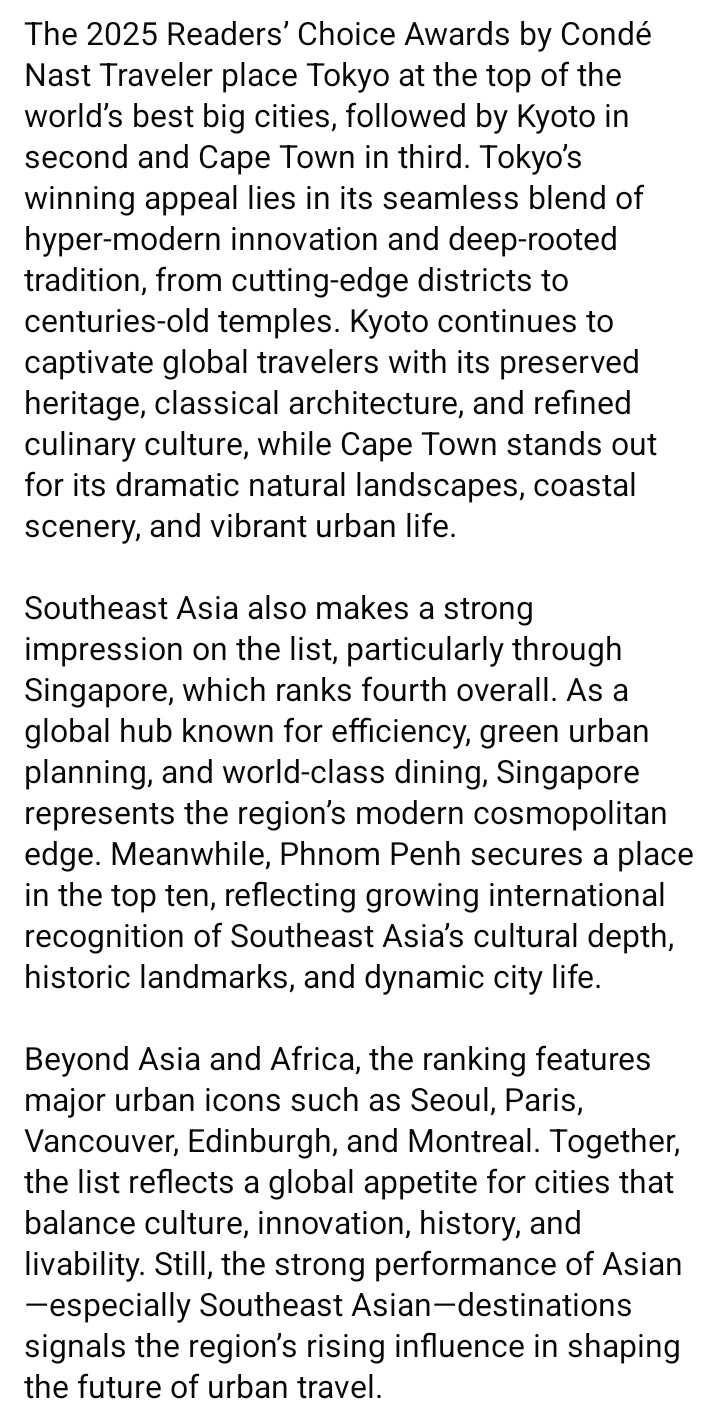 รางวัล Readers' Choice Awards ประจำปี 2025 ของ Condé Nast Traveler ยกให้โตเกียวเป็นเมืองใหญ่ที่ดีที่สุดในโลก ตามมาด้วยเกียวโตในอันดับสอง และเคปทาวน์ในอันดับสาม เสน่ห์ของโตเกียวอยู่ที่การผสมผสานนวัตกรรมที่ทันสมัยเข้ากับประเพณีที่สืบทอดมายาวนานได้อย่างลงตัว ตั้งแต่ย่านที่ทันสมัยไปจนถึงวัดวาอารามเก่าแก่หลายศตวรรษ เกียวโตยังคงดึงดูดนักท่องเที่ยวจากทั่วโลกด้วยมรดกที่ได้รับการอนุรักษ์ สถาปัตยกรรมคลาสสิก และวัฒนธรรมอาหารที่ประณีต ในขณะที่เคปทาวน์โดดเด่นด้วยภูมิทัศน์ธรรมชาติที่งดงาม ทิวทัศน์ชายฝั่ง และชีวิตในเมืองที่คึกคัก