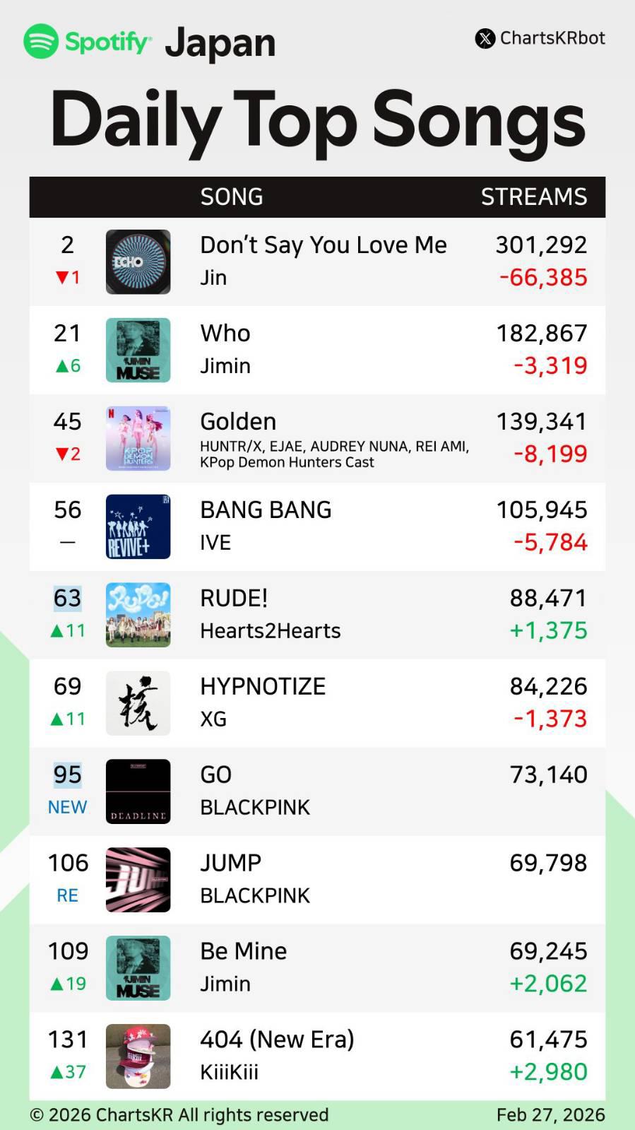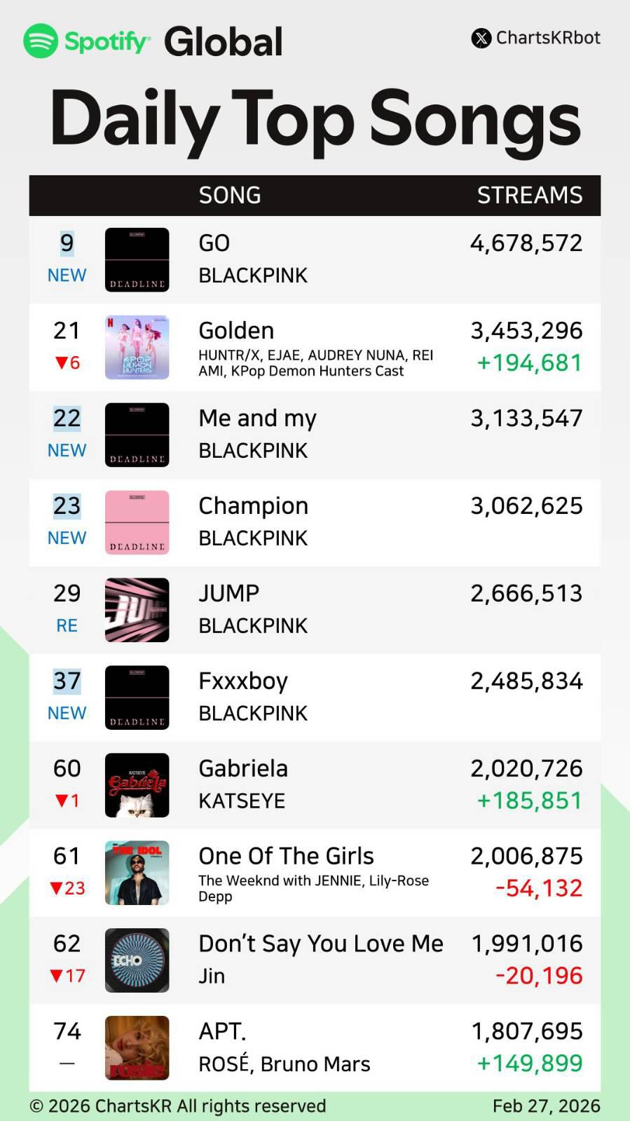 เพลง JUMP ของ BLACKPINK ขึ้นสู่จุดสูงสุดใหม่ที่อันดับ 15 บนชาร์ต Spotify ของสหรัฐอเมริกา โดยมียอดสตรีม 906,246 ครั้ง