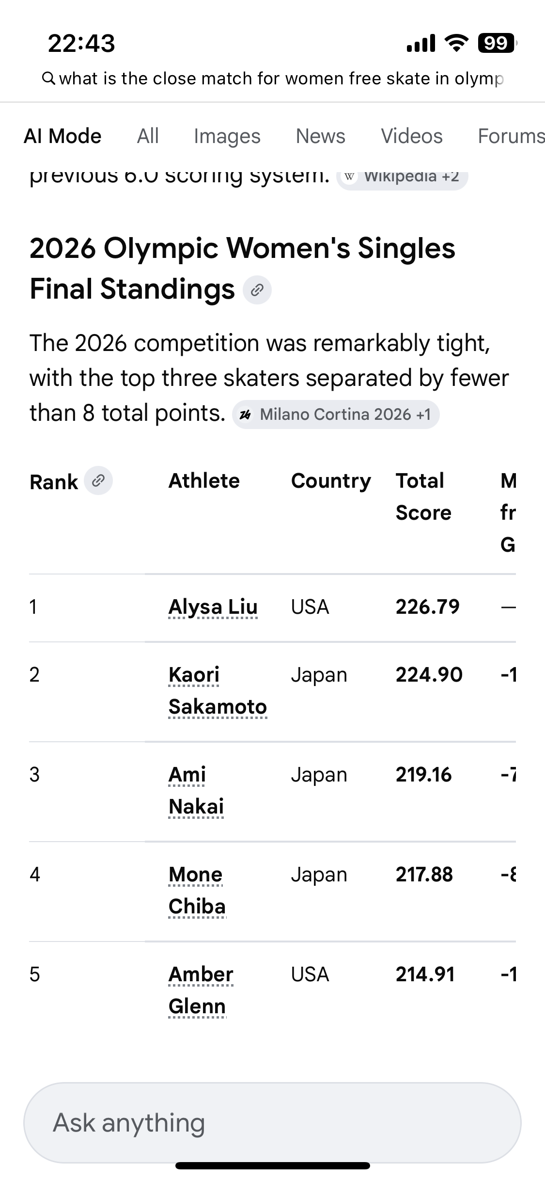 ปล. นับว่าเป็นผลการแข่งขันสเก็ตน้ำแข็งลีลาหญิงเดี่ยวที่มันส์ที่สุดในประวัติศาสตร์เลยก็ว่าได้ เพราะอันดับที่ 1 และ 2 เฉือนกันไปเพียงแค่คะแนนเดียวเท่านั้นเองครับ 😅