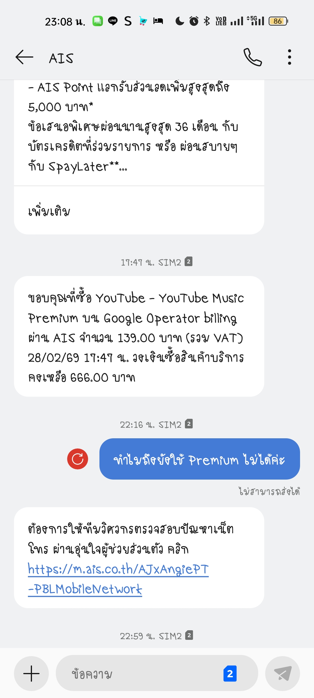รอบแรก (17:47 น.): กดสมัคร YouTube Music Premium ระบบ AIS ส่ง SMS ยืนยันว่า หักเงินสำเร็จ 139 บาท แต่ปรากฏว่าใช้งานไม่ได้ พยายามรีสตาร์ทเครื่องและเช็กใน Google Play แล้ว ไม่พบประวัติการสั่งซื้อ (แปลว่าเงินค้างที่ AIS ยังไม่ถึง Google)