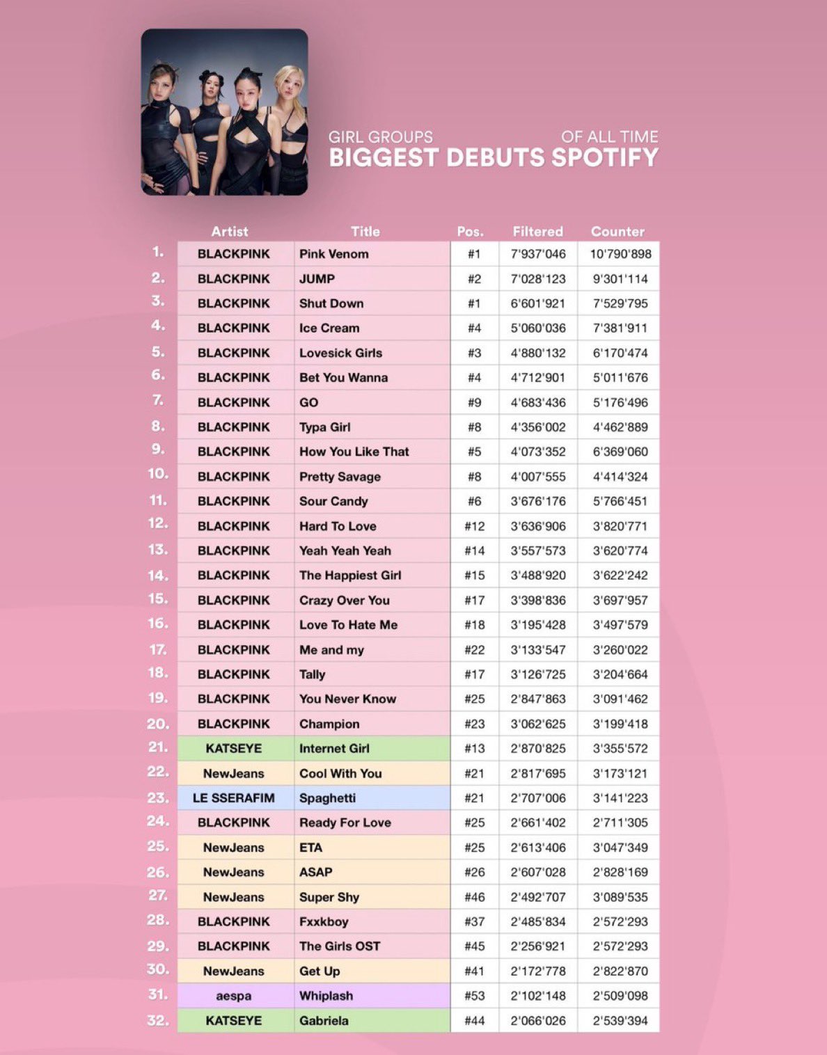 เพลงของ BLACKPINK ครองทั้ง 20 อันดับแรกของเพลงเกิร์ลกรุ๊ปที่มียอดสตรีมเดบิวต์สูงที่สุดตลอดกาลบน Spotify