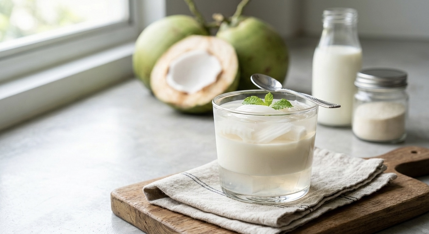เนื้อมะพร้าวอ่อน: หั่นเป็นชิ้นพอดีคำ เราชอบแบบนิ่ม ๆ