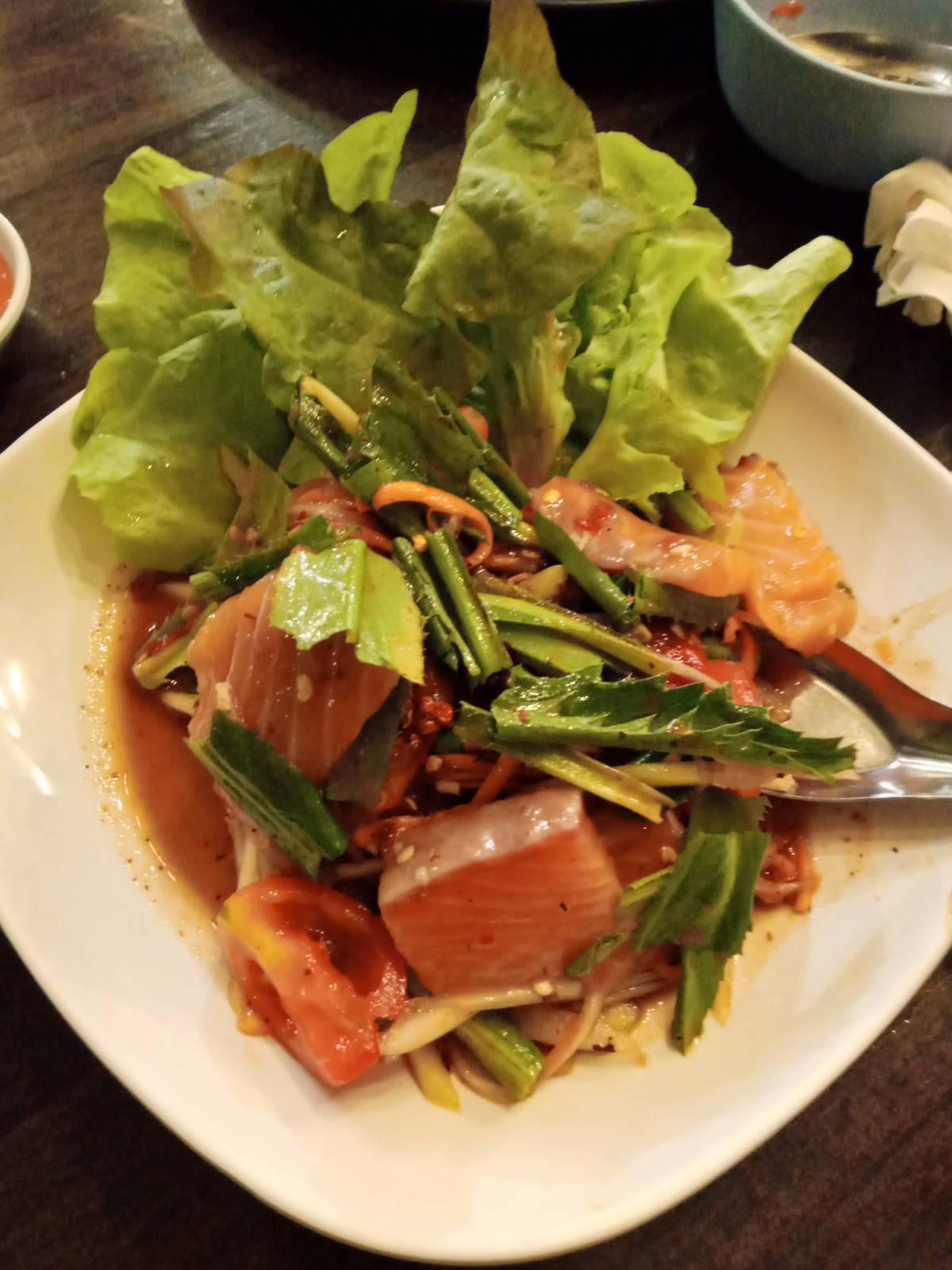 ตำแซลมอน จานนี้ไม่ได้กินนะคะ แต่สีสวยดี