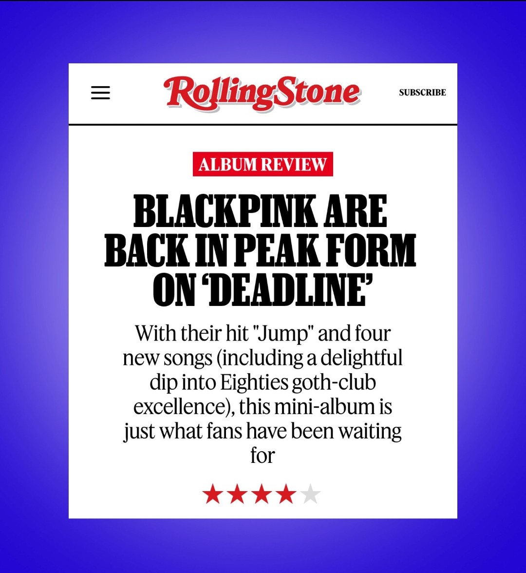Rolling Stone ให้เรทอัลบั้ม DEADLINE ที่ 4/5 โดยนิยามว่า"BLACKPINK กลับมาพร้อมฟอร์มสุดยอดอีกครั้งด้วย DEADLINE" น่าปลื้ม