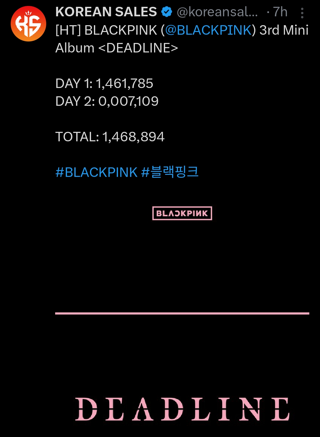 ยอดขายอัลบั้ม DEADLINE ของ BLACKPINK วันที่ 2 ทำยอดขายไปได้ 7,109 แผ่น