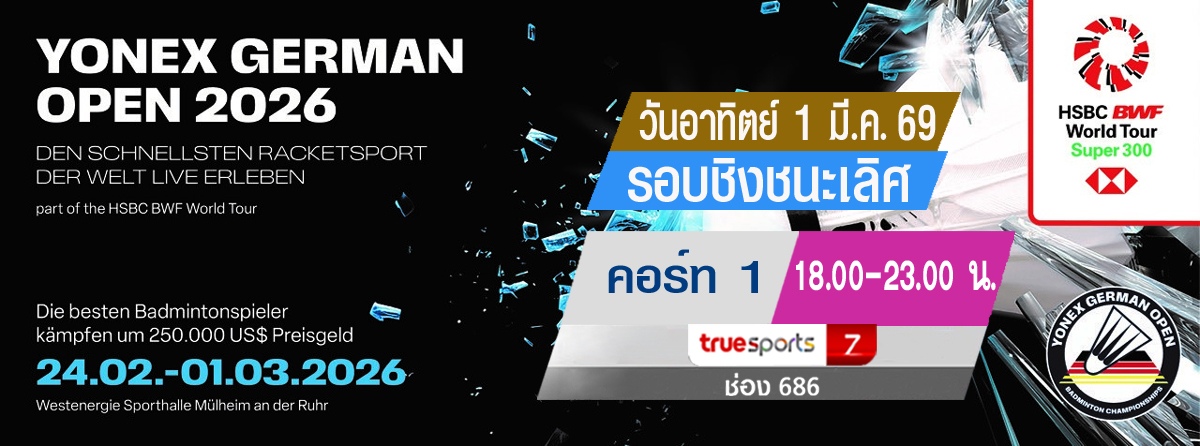 โปรแกรมการแข่งขัน แบดมินตัน YONEX German Open 2026 : รอบชิงชนะเลิศ (1 มี.ค. 69) (คู่แรก 18.00 น.)