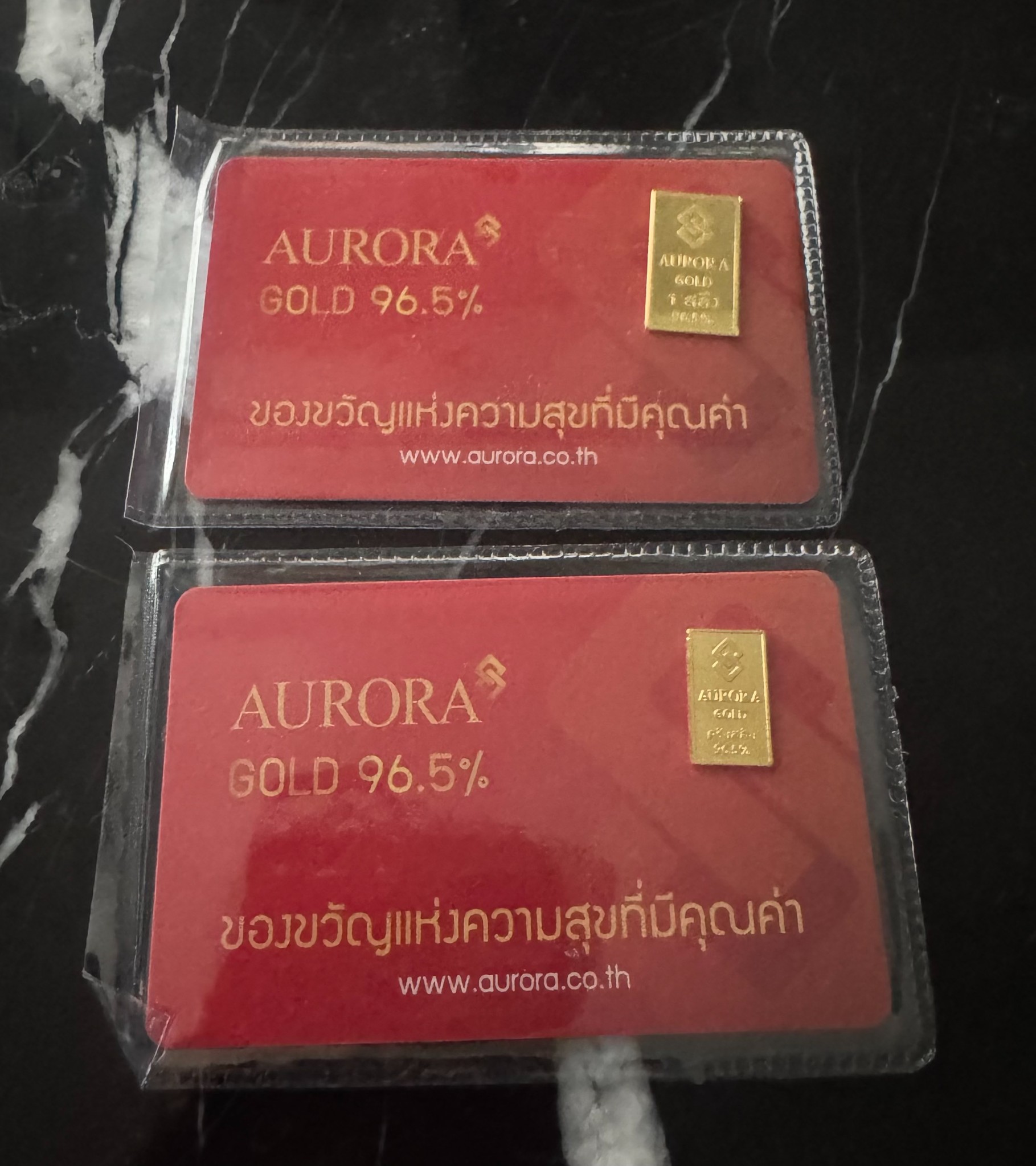 เมื่อวานไปไม่ทันเพราะร้านประกาศยกเลิกขายทองคำแท่งชั่วคราวเพราะราคาผันผวนสูงวันนี้ไปซื้อของในห้างที่มีร้านออโรร่าพอดีเลยลองถามพนักงานบอกว่ามีแต่น้ำหนัก 1สลึง, 0.5สลึง, 1กรัม เลยลองเสี่ยงดูเท่าที่พอรับความเสี่ยงไหวเหมือนซื้อหวยว่าจะโชคดีถูกเลขท้าย 2ตัวมั้ย