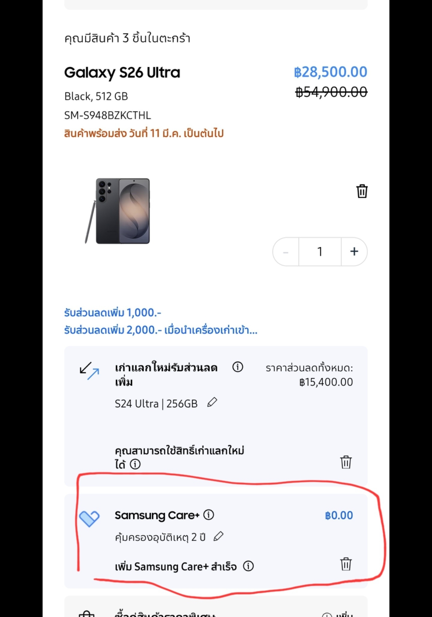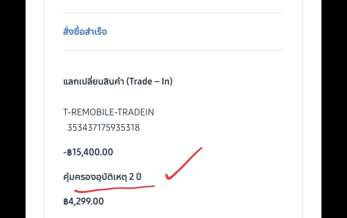 หน้าสรุปขึ้น ว่าได้รวม Care Plus 2 ปี เลยตัดสินใจกดซื้อ เพราะพอใจกับราคา หลังจากซื้อรายการยืนยันก็ยังมีขึ้นว่าได้รับประกันอุบุติดหตุ 2 ปีอยู่