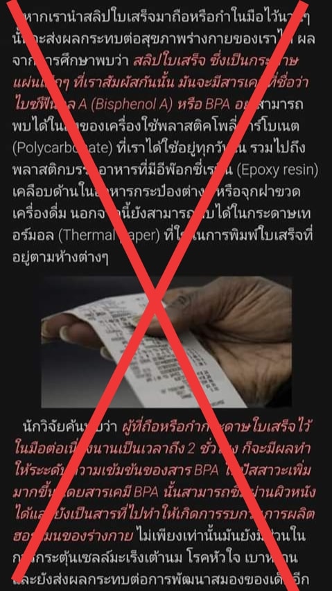 มีการแชร์บทความที่บอกทำนองว่า "การถือหรือกำสลิปใบเสร็จไว้ในมือ จะส่งผลเสียต่อสุขภาพ เพราะกระดาษใบเสร็จแบบกระดาษเทอร์มอล มีสาร bisphenol A หรือ BPA อยู่