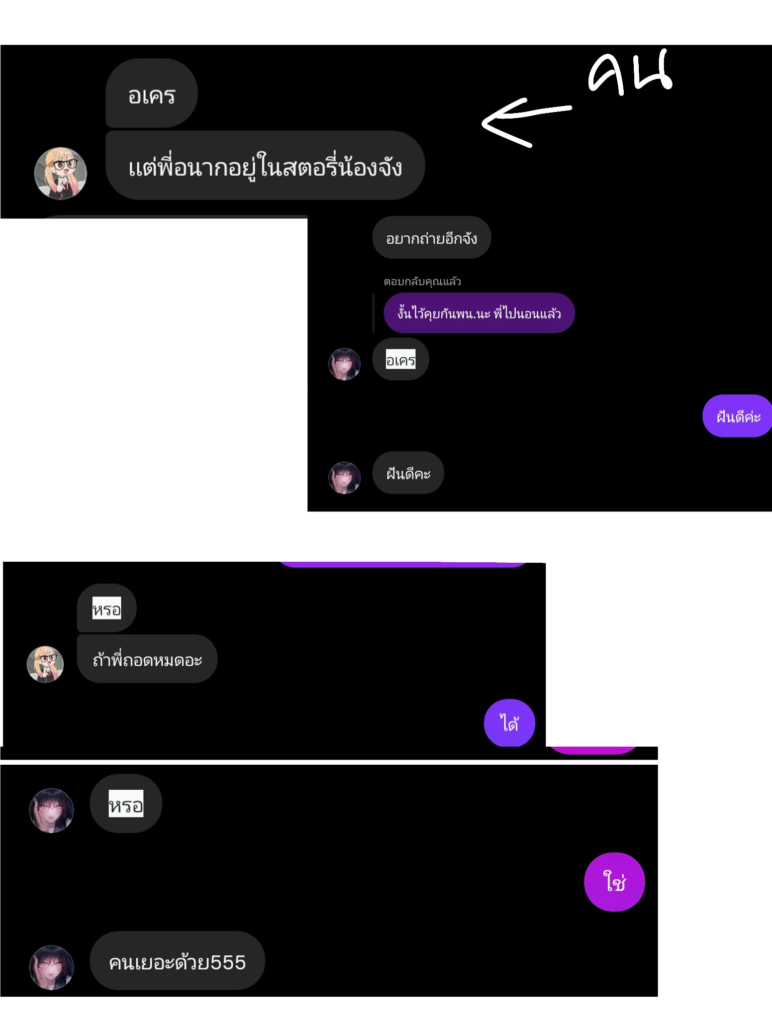 คือ วันนี้เราเล่นแอปเดิมค่ะ แล้วก็มีผู้หญิงคนนึงทักเรามา (รุ่นพี่) แล้วก็ชวนเราคุยเรื่อง18+ประมาณว่าแบบ ชอบแก้ผ้านะ อะไรประมาณนี้ เราก็เลยแกล้งๆขอดู ลากมา อจ.เหมือนเดิม เข้าอีหรอบเดิมเลยค่ะ ถามนู่นนั้นนี่ อยากได้แบบไหน ท่าไหน ปิดอะไรมั้ย เราก็ตอบไปแบบเดิมว่าแล้วแต่ เขาก็ส่งรูปตัวเอง(?)ในชุดวันเกิดมาให้ค่ะ เราก็เริ่มเอะใจแล้ว เพราะภาษาการพิมพ์ของพี่คนนี้ดูเหมือนน้องคนแรกที่เราคุยเลยค่ะ เช่น โอเคเขาจะพิมพ์ว่า อเคร หรือเวลาบอกอะไรเขาจะชอบพิมพ์ว่า หรอ กลับมาก่อน หรือแม้กระทั่งตอนเราจะจบบทสนทนาเขาจะพิมพ์ อเคร แล้วก็ชวนคุยต่ออีก แถมยังทำท่าทางอยากถ่ายให้เราดูอีกเยอะๆ ขอรีเควสท่าแอดวานซ์ๆจากเรา แล้วที่น่าตกใจคือเขาขอให้เราวาดรูปเขาให้ด้วยค่ะ แต่เราก็ยอมวาดให้ทั้งคู่นะคะ เหมือน2คนนี้เขาจะถามเหมือนกันด้วยค่ะว่าวาดเสร็จวันไหน วาดอีกได้มั้ยประมาณนี้ค่ะ แต่2คนนี้หน้า หุ่น ลักษณะภายนอกแตกต่างกันมากๆค่ะ