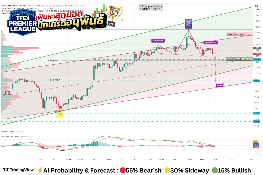 รวม: S50H26 TF15 นาที ระยะสั้นกราฟเสียทรงขาขึ้นหลังเกิด Bearish Divergence ใน RSI และ MACD พร้อมฟอร์มตัวเป็นรูปแบบ Head & Shoulders ถ้าหลุด 1009 แนวรับใหญ่ถัดไป 994