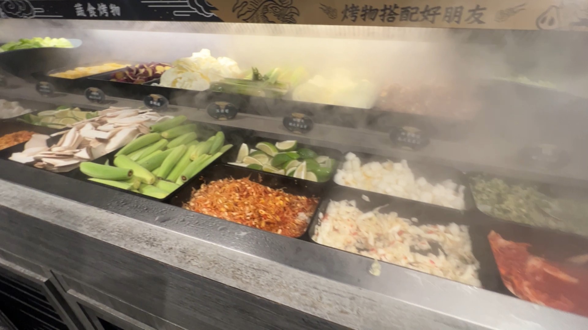 โซนผักและเครื่องเคียง (Veggie Bar) : โซนนี้อลังการมาก มีควันดรายไอซ์ลอยฟรุ้งฟริ้งดูสดชื่นสุดๆ ผักสดกรอบมีให้เลือกเพียบ แถมเครื่องเคียงก็เยอะ เอามากินแกล้มตัดเลี่ยนกับเนื้อย่างได้เพลินมากๆ สั่งเนื้อเพิ่มได้อีกรัวๆ!