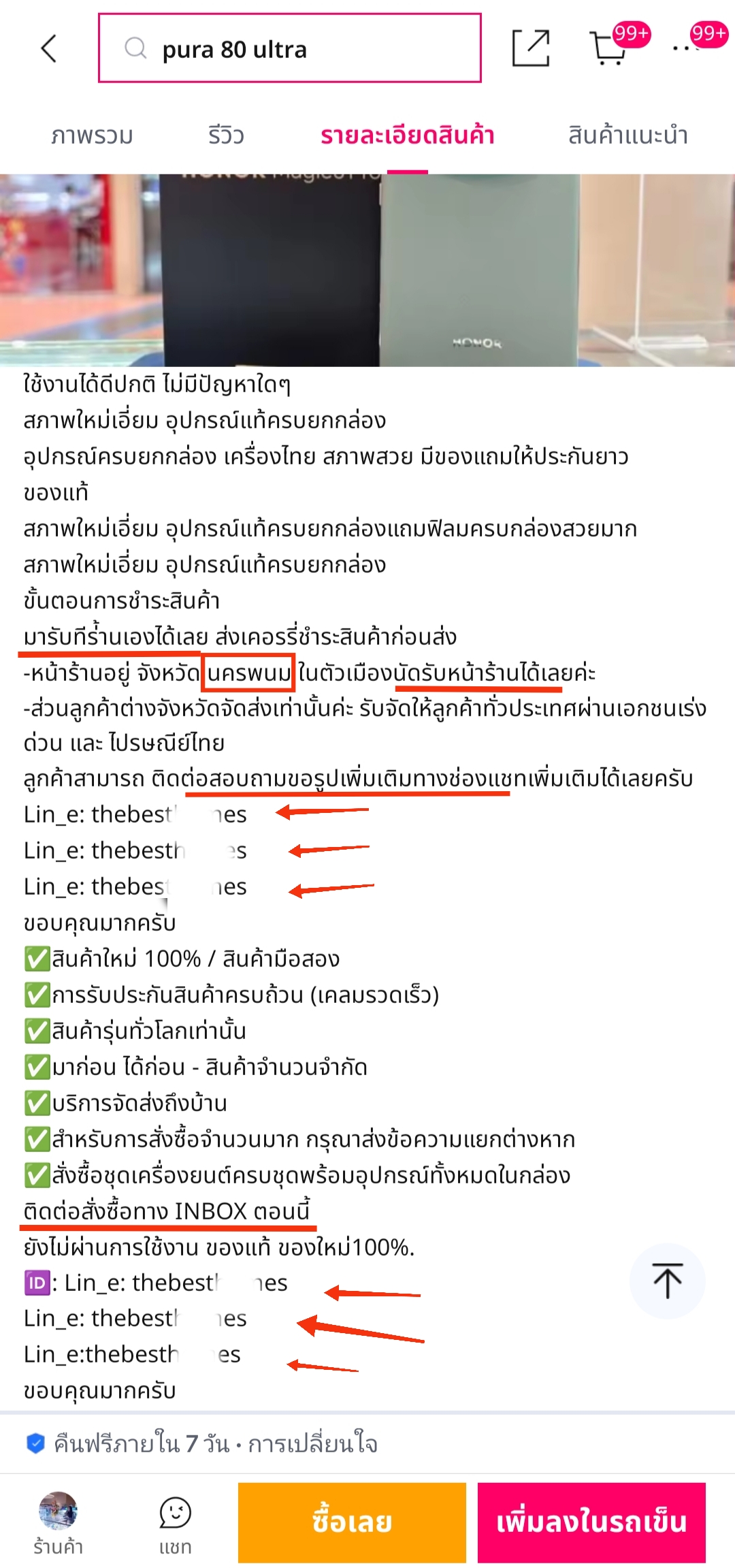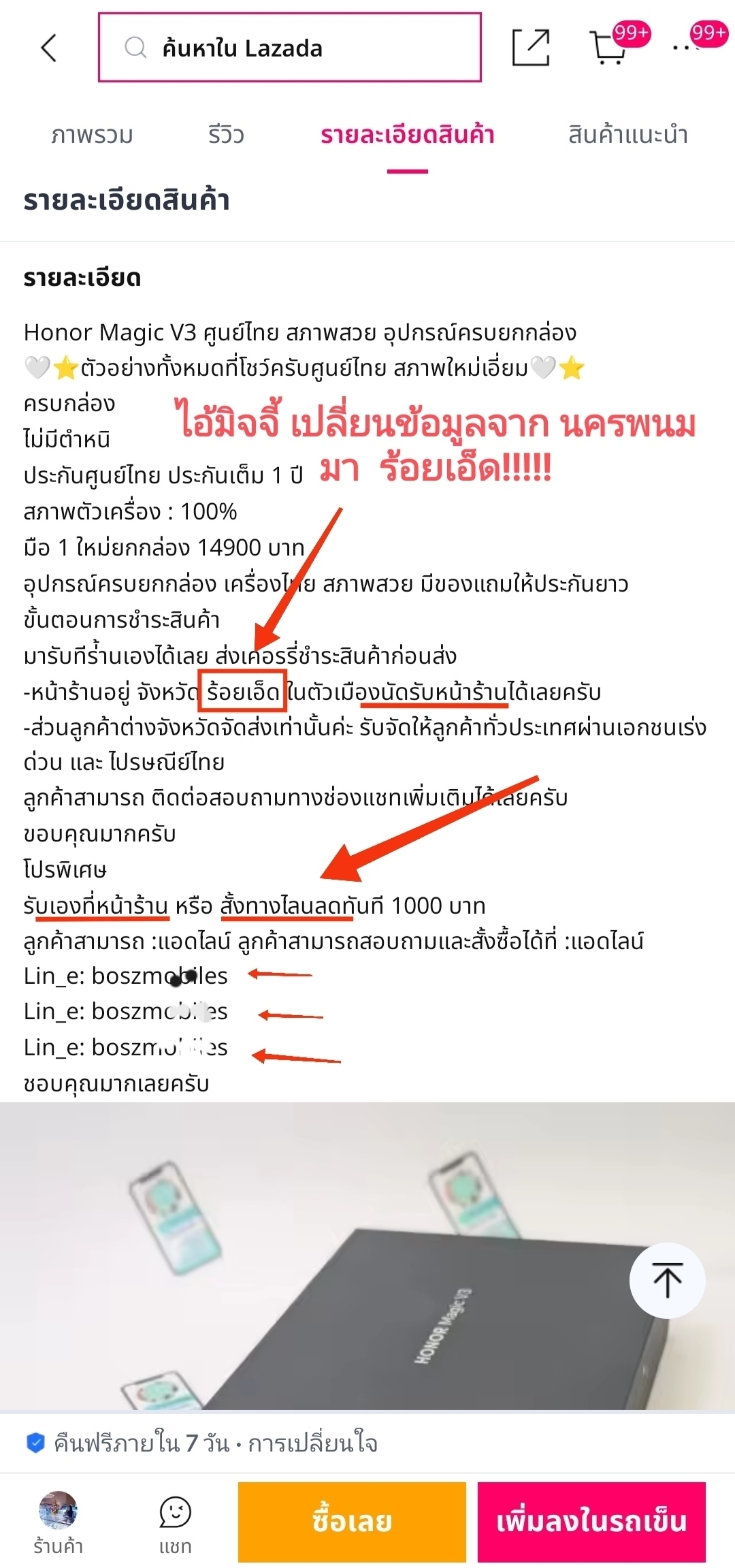 ลงไอดีไลน์ ในหน้ารายละเอียดสินค้าในแอปlazadaเปรอะไปหมด แทนที่จะลงรายละเอียดสินค้าให้ ชัดเจน ครบถ้วน