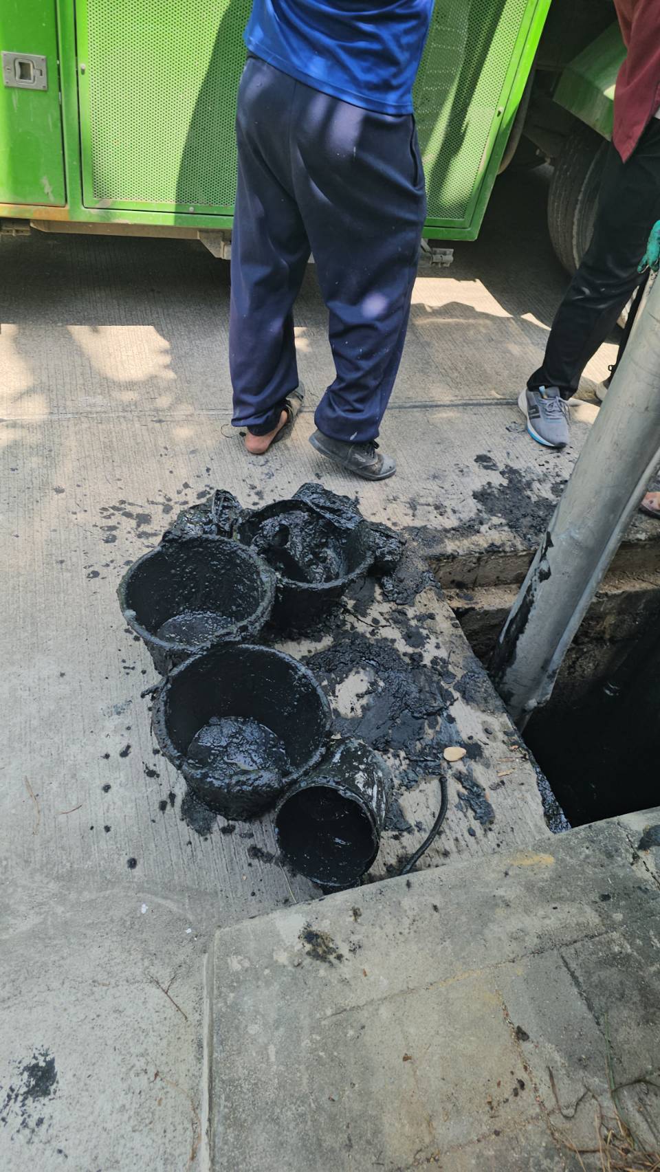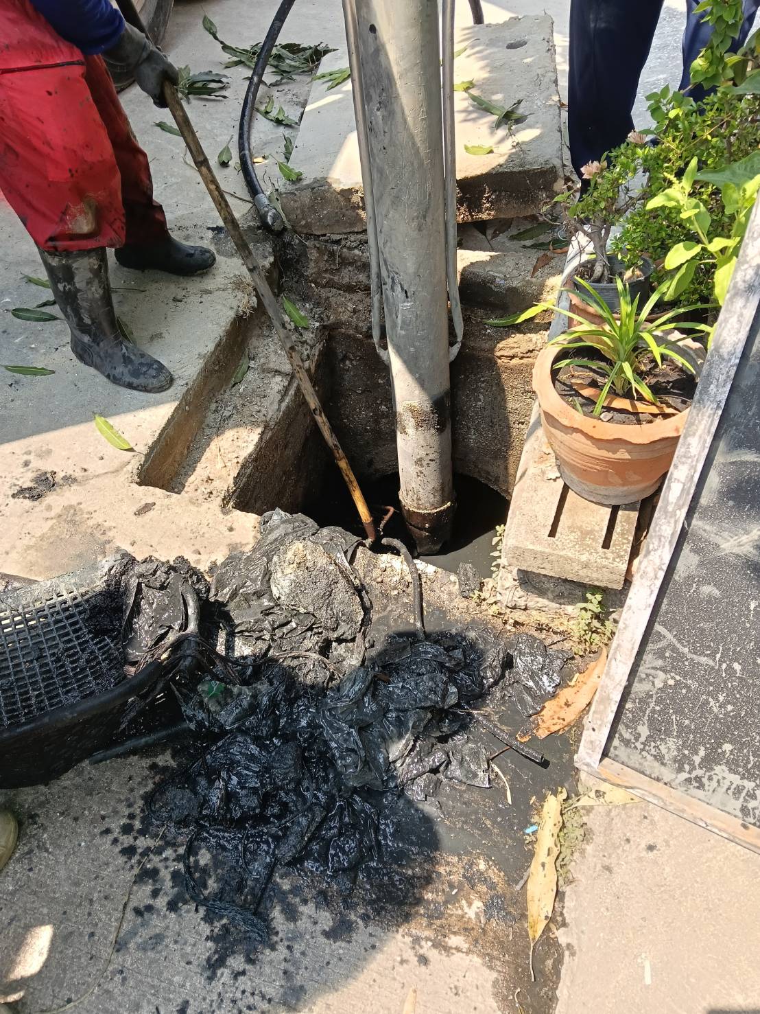 เมื่อทีม จนท.มาถึงและเริ่มทำงาน ทุกคนก็ต้องร้อง โอ้โห!!! กับสิ่งที่ได้เจอ..... เมื่อเปิดฝาท่อออกมา ท่อระบายน้ำขนาดไม่เกิน 1 เมตร เต็มไปด้วย ดิน โคลน ขยะ สิ่งปฎิกูล เต็มท่อ บางจุดเป็นซีเมนต์แข็งๆ ขวางทางน้ำ แล้วน้ำมันจะไหลไปช่องไหนกันละเนี่ย