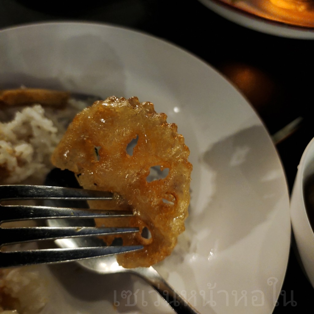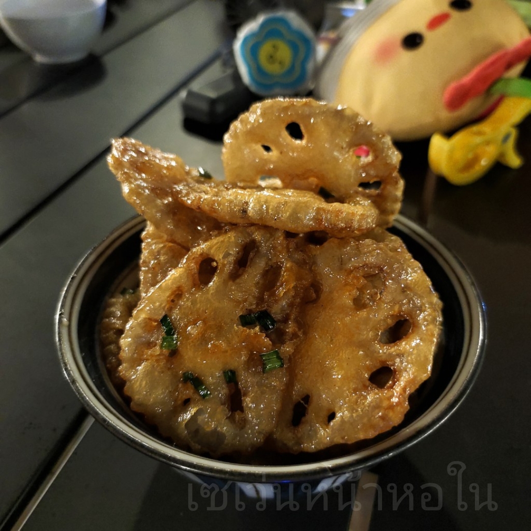 เป็นรากบัวทอดคลุกน้ำซอสสูตรของทางร้าน กินแล้วมีความกรอบนอก นุ่มใน