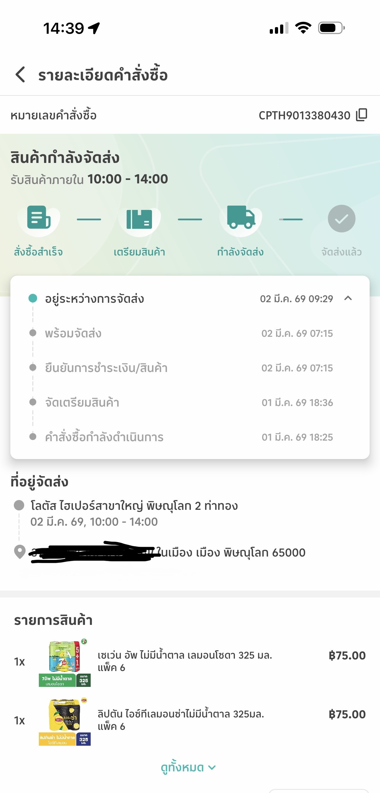 วันนี้ 2 มี.ค. แจ้ง อยู่ระหว่างการจัดส่ง ตั้งแต่ 09.29 น. จนตอนนี้ 14.45 น. ยังไม่มีขนส่งโทรมาเลย