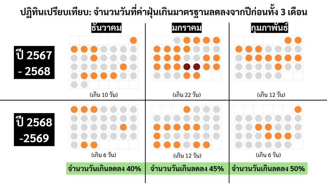 จำนวนวันที่ค่าฝุ่นเกินมาตรฐาน ลดลงราว 50% (เทียบกับเมื่อก่อน)