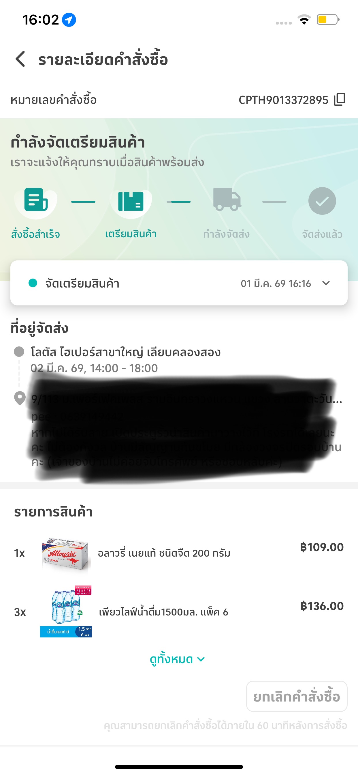 สั่งแบบสั่งสินค้า ข้ามวัน 24 ชม. คือ สั่งวันนี้ 16.00น.สั่งวันถัดไป 16.00 พอถึงเวลา ปุ๊บมีพนักงานโทรมา ด้วยเบอร์ 0812459043 รับสายไม่ทัน จึงโทรกลับพนักงานแจ้งว่า วันนี้ส่งไม่ทันขอส่งวันถัดไป คือ48ชม. เราจึงถามว่าเหตุผลคืออะไรจึงส่งวันถัดไป ให้แจ้งด้วย น้องตอบมาด้วยเสียงราบเรียบว่า ไม่มีรถเข้ารับสินค้า “เราอึ้งนิดหน่อย เงียบและ กำลังตัดสินใจ ” และถามกลับด้วยความงง และเพื่อย้ำความคิดว่า ไม่มีรถมาส่ง จึงบอกน้องว่า อะเครไม่เป็นไรพี่ขอยกเลิก แล้วจะไปซื้อสินค้าเอง น้องพนักงาน วางสายไปเลย โดยไม่แจ้งวิธิการยกเลิก ใดๆ “ ”พอเราเข้าไปในระบบไม่มีปุ่มให้ยกเลิก โทรเข้า คอลเซ็นเตอร์ 1430 ไม่ได้รับการแก้ไข คุยกับเจ้าหน้าที่ไม่ได้ แบบนี้ เรารู้สึกเหมือนโดนบังคับ ในนามผู้บริโภค ที่เข้าใช้บริการ เราคิดว่ามีวิธีแก้ปัญหามากมาย รถวิ่งรับส่งก็มากมาย เราสั่งสินค้า 13รายการ ยอดเงินพันกว่าบาท ขอเงินคืนไม่ได้ สินค้าก็ไม่ได้ ยกเลิกก็ไม่ได้ (รบกวนผู้ให้บริการ บริหารจัดการให้เข้าถึงผู้บริโภค สร้างความเชื่อมั่นและความไว้ใจที่จะเข้ารับบริการออนไลน์ด้วย)