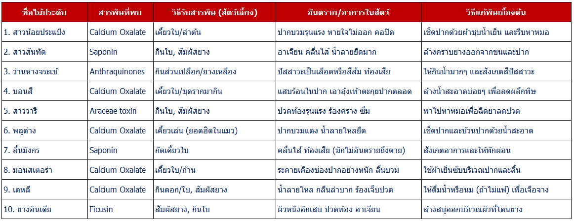 ---กระทรวงการอุดมศึกษา วิทยาศาสตร์ วิจัยและนวัตกรรม (อว.) ของไทย ที่รวบรวมข้อมูลพรรณไม้ยอดฮิตที่คนไทยชอบปลูก (เช่น มอนสเตอร่า, กวักมรกต, ไทรใบสัก) และระบุความเป็นพิษต่อสัตว์เลี้ยงไว้อย่างชัดเจน