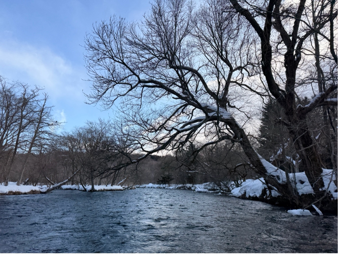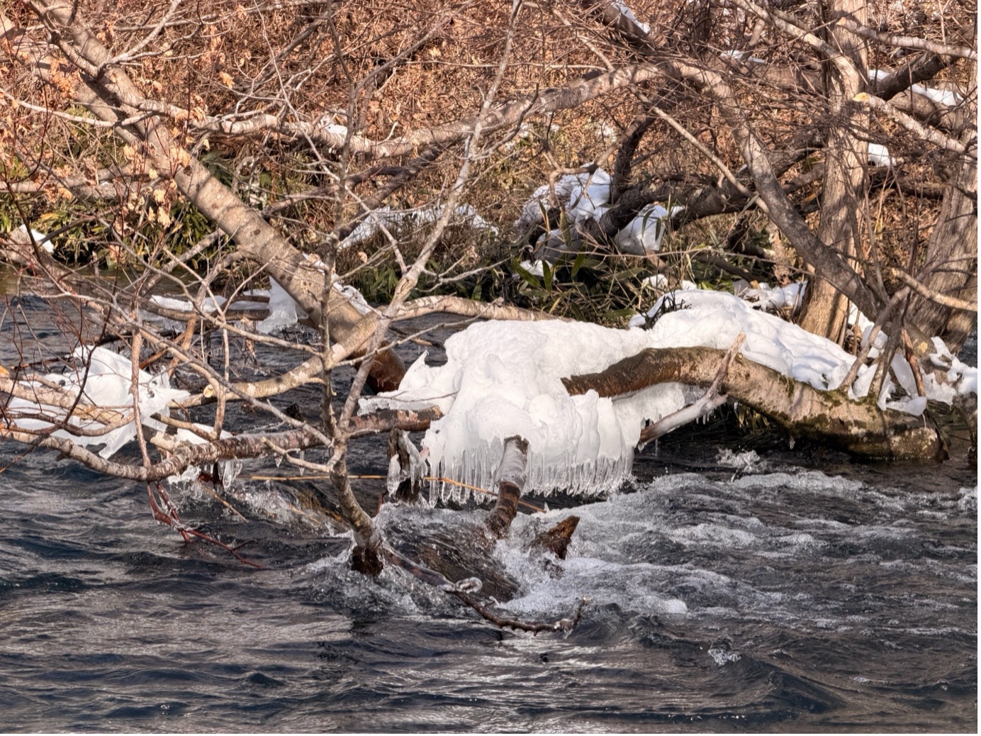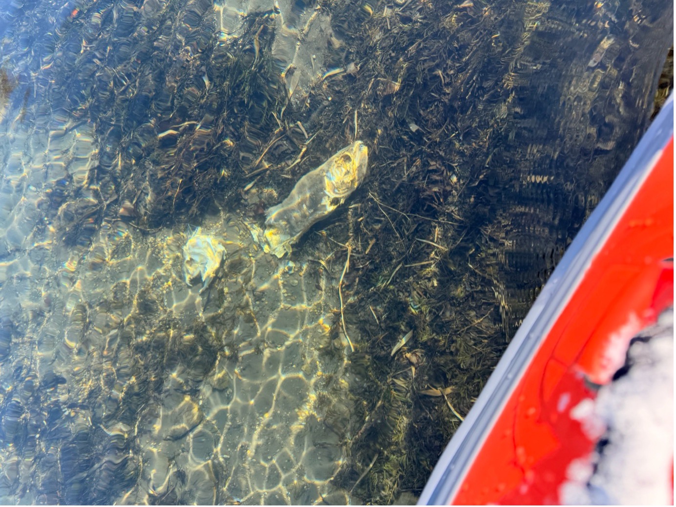 ส่วนในน้ำก็ใส่กิ๊กจนเห็นด้านล่างเลย มีซากปลาแซลม่อนเพราะหากเป็นช่วงฤดูร้อนก็จะมีปลาแซลม่อนว่ายในแม่น้ำให้เห็นด้วย