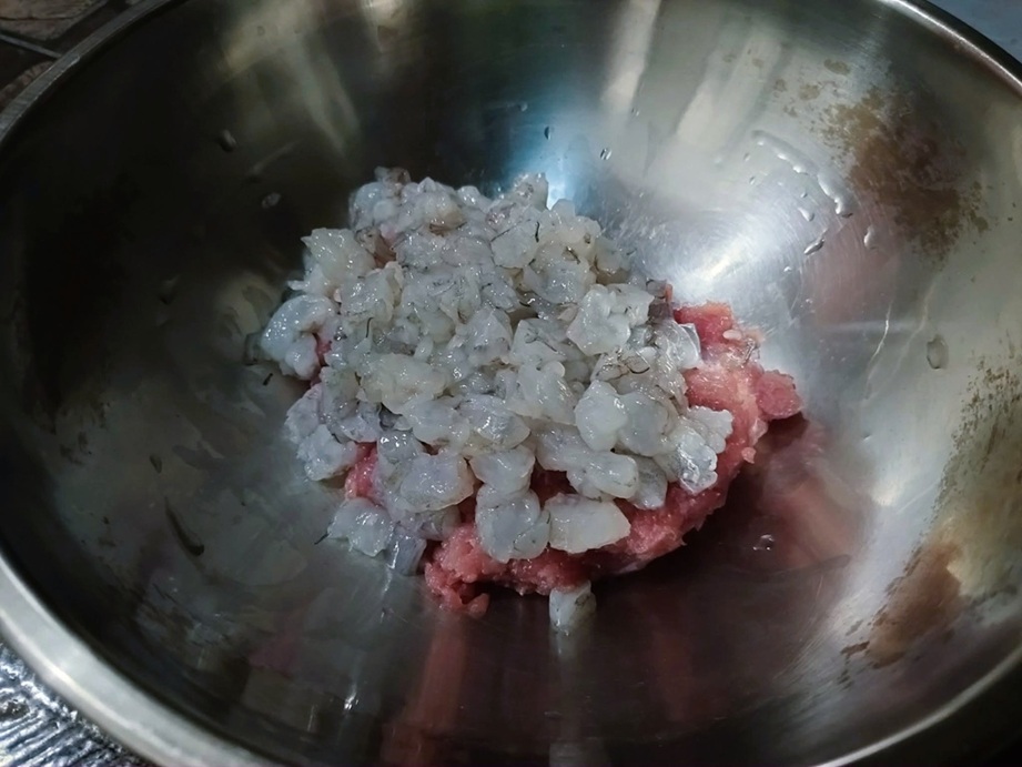 ซึ่งก็นำมาผสมกับเนื้อกุ้งส่วนหนึ่ง แล้วทำการนวดหมักปรุงรสด้วย... กระเทียมและพริกไทยเม็ดตำละเอียด ไข่ไก่ ซีอิ๊วขาว ผงปรุงรส น้ำตาลทราย แป้งมันสำปะหลัง เห็ดหอมสด แครอทและใบต้นหอมเล็กน้อยค่ะ