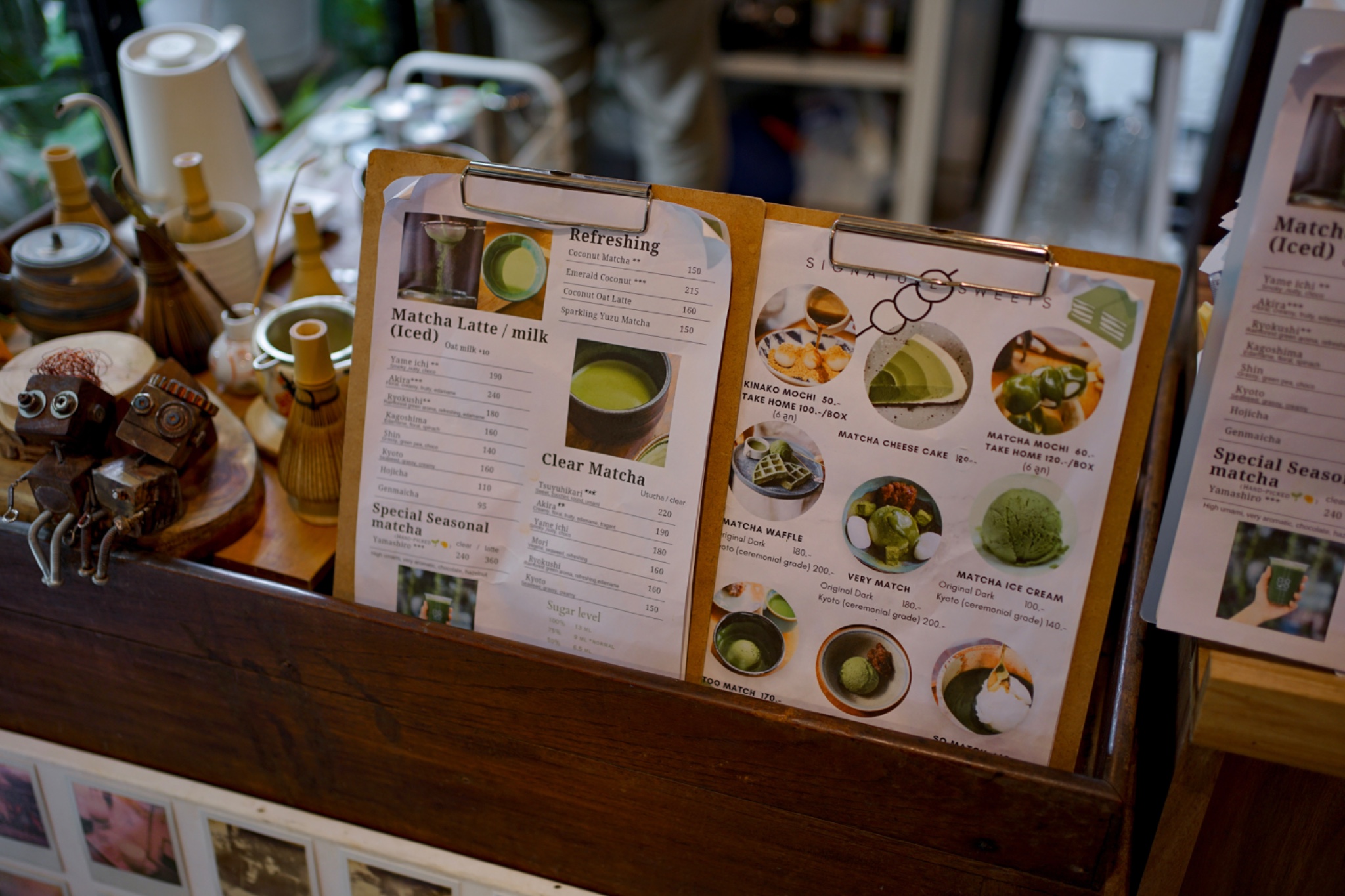 ทางร้านมีมัทฉะให้เลือกหลากหลายชนิด พู่ลองเป็น 𝐀𝐤𝐢𝐫𝐚 𝐋𝐚𝐭𝐭𝐞 240฿ โทนตัวนี้จะเป็น 𝐟𝐥𝐨𝐫𝐚𝐥, 𝐜𝐫𝐞𝐚𝐦𝐲, 𝐟𝐫𝐮𝐢𝐭𝐲, 𝐞𝐝𝐚𝐦𝐚𝐦𝐞 อร่อยมาก อีกแก้วของพีชเป็น 𝐂𝐨𝐜𝐨𝐧𝐮𝐭 𝐌𝐚𝐭𝐜𝐡𝐚 150฿ ส่วนขนมคือ 𝐌𝐚𝐭𝐜𝐡𝐚 𝐂𝐡𝐞𝐞𝐬𝐞 𝐂𝐚𝐤𝐞 180฿ เป็นเลเยอร์เค้กตัวดังของที่นี่เลย ตัวเค้กมี 𝟒 𝐥𝐞𝐯𝐞𝐥 โดยจะไล่ระดับความเข้มข้นของมัทฉะ บอกเลยว่ามาแล้วต้องสั่งน้า รับรองว่าติดใจแบบพู่แน่นอน 🫶🏻