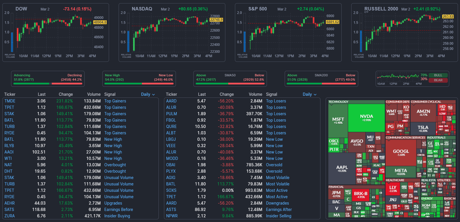 ในช่วงเปิดตลาด ดัชนีร่วงลงแรงตามแรงขายที่เกิดจากความกังวลด้านภูมิรัฐศาสตร์ หลังการโจมตีที่มีรายงานว่าคร่าชีวิตผู้นำสูงสุดของเตหะราน ส่งผลให้น้ำมันดิบพุ่งขึ้นทันที และตลาดหุ้นหลายประเทศในต่างแดนปิดลบ อย่างไรก็ตาม นักลงทุนสหรัฐบางส่วนมองว่าเหตุการณ์อาจจำกัดวงกระทบในระยะสั้น จึงเข้าซื้อหุ้นเมื่อราคาปรับฐาน ช่วยพยุงตลาดให้ฟื้นตัวระหว่างวัน