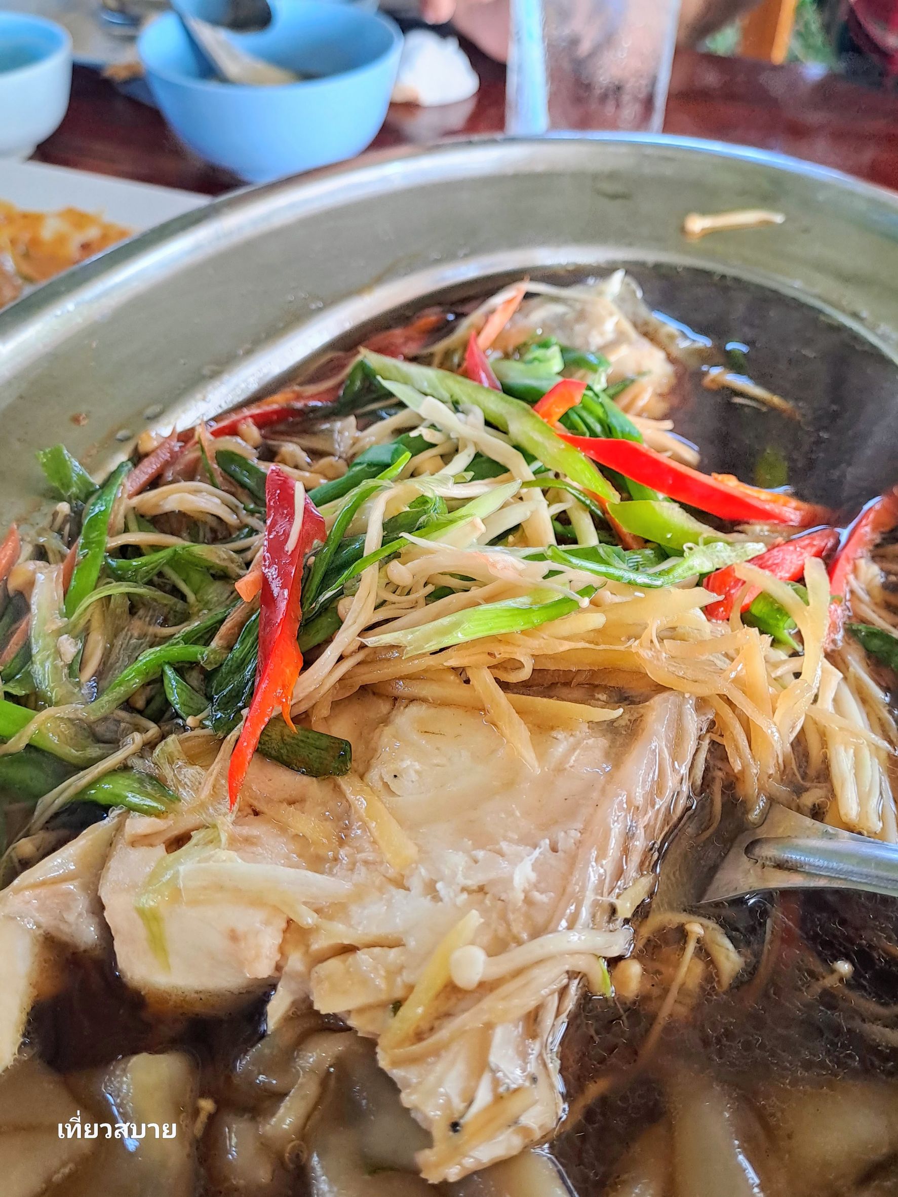 ที่แปลกใหม่คือ เสิร์ฟคู่กับ “เส้นใหญ่ทอด”หอมๆ มันๆ พอเอาเนื้อปลานุ่ม ๆ วางบนเส้นทอด แล้วราดน้ำจิ้มหน่อย ได้ทั้งความนุ่ม และความหวานธรรมชาติของปลาในคำเดียว บอกเลยฟินนน เป็นเมนูที่จขกท.เพิ่งเคยทานเป็นครั้งแรก และยกให้เป็นจานที่ถูกใจที่สุดของมื้อนี้เลยค่ะ