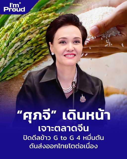 วันที่ 1 มีนาคม 2569 นางศุภจี สุธรรมพันธุ์ รัฐมนตรีว่าการกระทรวงพาณิชย์ เปิดเผยว่า ไทยประสบความสำเร็จในการบรรลุข้อตกลงซื้อขายข้าวแบบรัฐต่อรัฐ (G to G) กับสาธารณรัฐประชาชนจีน โดยเตรียมส่งมอบข้าวขาว 5% ลอตแรกจำนวน 40,000 ตัน ภายในเดือนกุมภาพันธ์ 2569 และตั้งเป้าขยายปริมาณรวมให้ครบ 500,000 ตันภายในปีนี้
